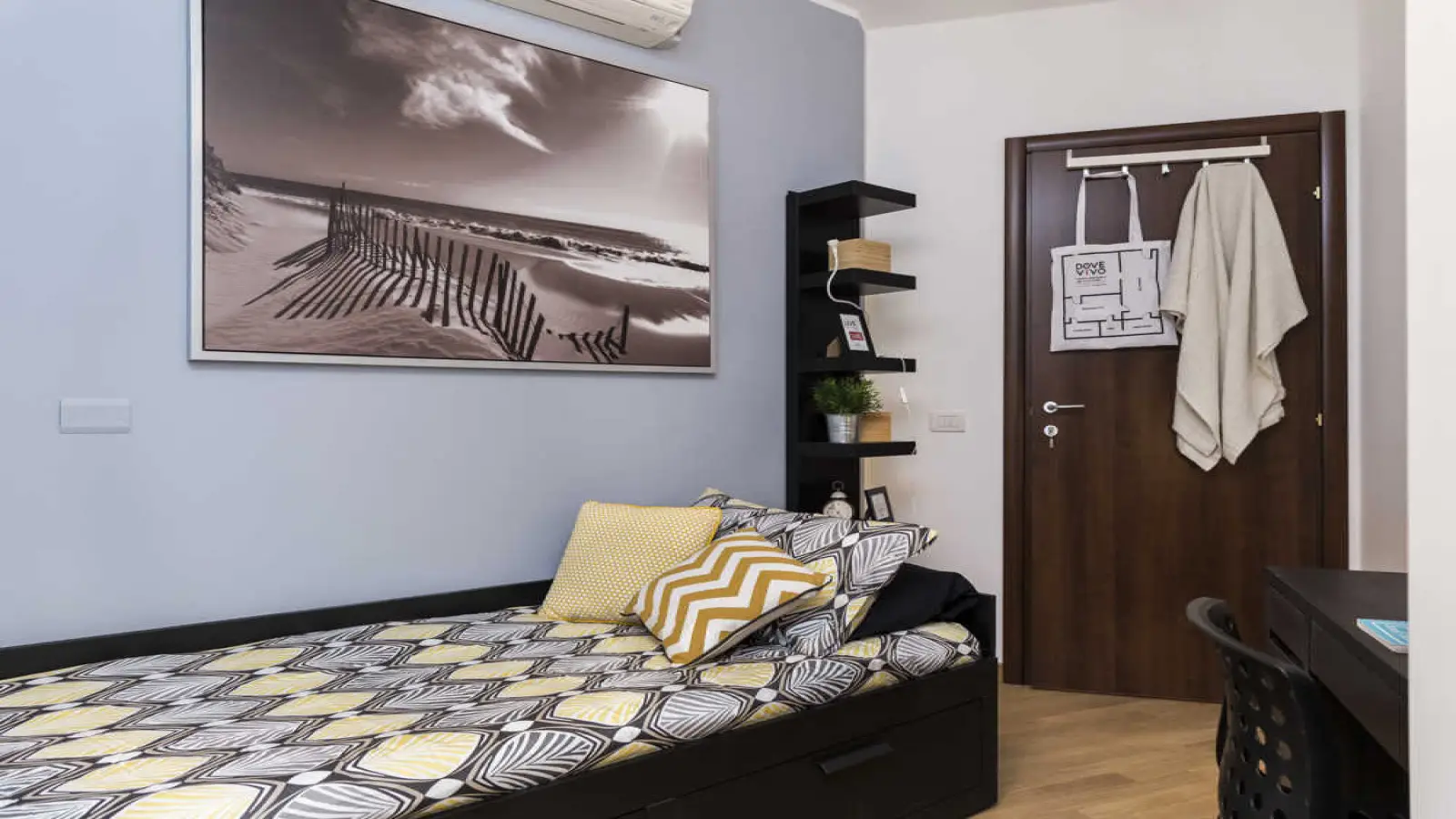 Chambre individuelle dans un appartement partagé, composé de 3 chambres et 1 salle de bain. D'environ 10 m² avec un lit simple et un poste de travail. Avec wifi, climatisation, lave-vaisselle, lave-linge. Classe énergétique : B, IPE 31,15 Kwh/m² an.