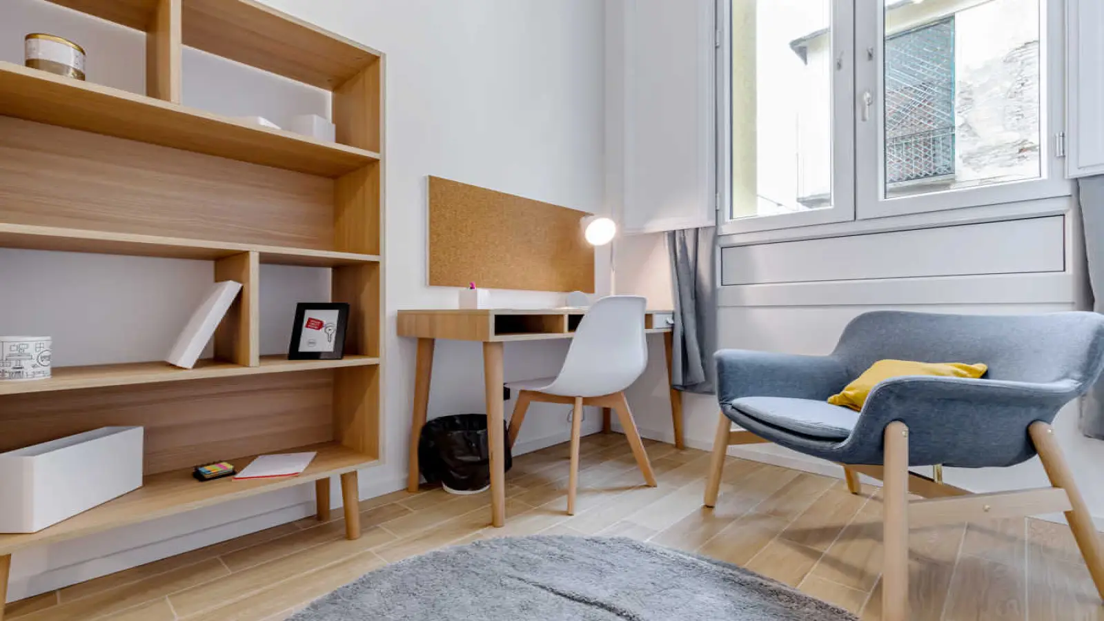 Chambre individuelle dans un appartement partagé, composé de 7 chambres et 3 salles de bain. D'environ 13 m² avec un lit une place et demie et un poste de travail. Avec wifi, climatisation, parking vélo, lave-vaisselle, lave-linge. Classe énergétique : A, IPE 102,05 Kwh/m² an.
