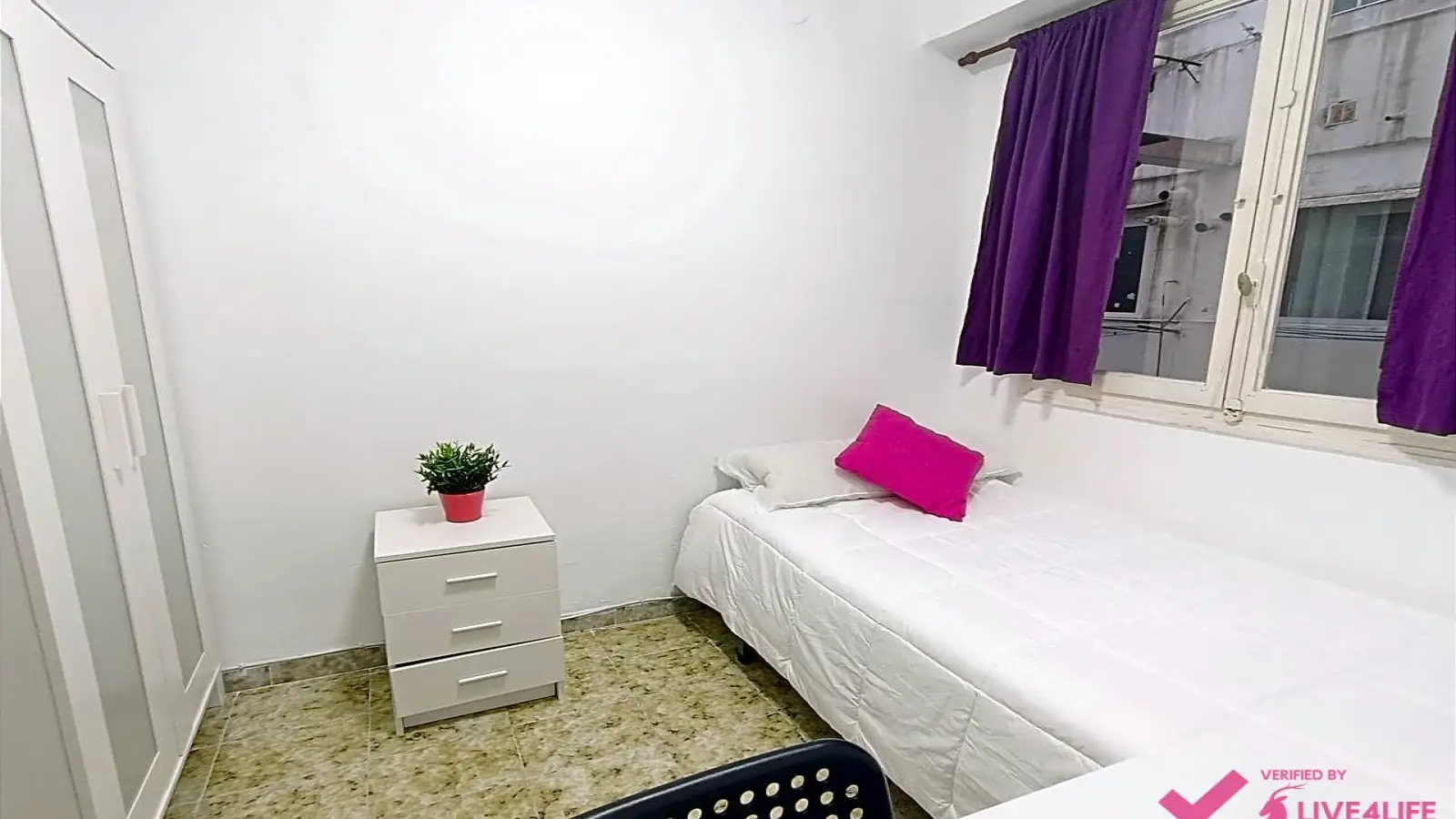 Il s'agit d'une chambre dans un appartement partagé de 4 chambres à Aiora, Valence. L'appartement est meublé et comprend une cuisine équipée, un four et un chauffe-eau électrique. Il est interdit de fumer, d'amener des animaux domestiques et de se garer. Le Wi-Fi et l'eau sont inclus dans le prix de la location.