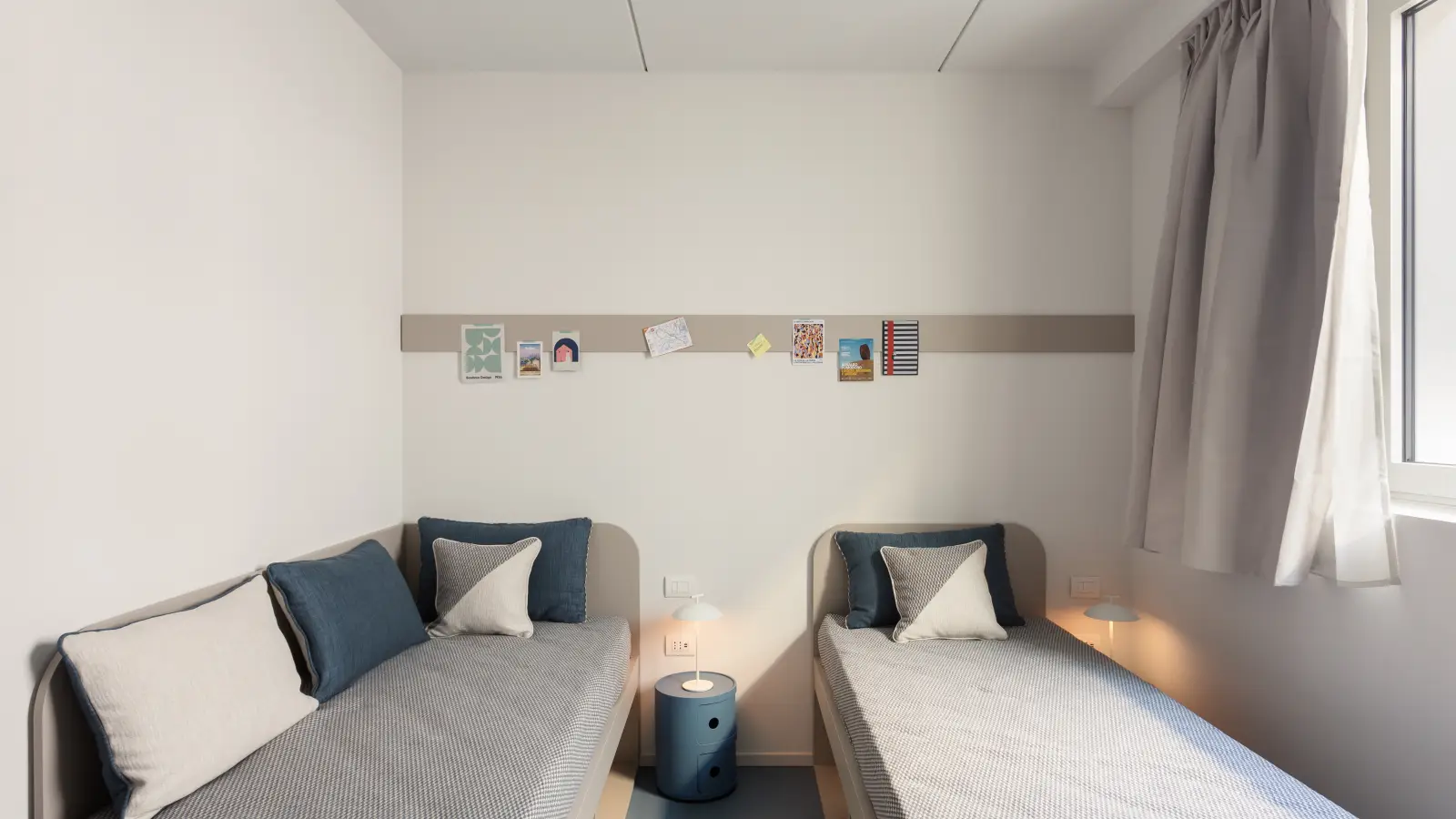 Questa camera doppia è progettata per una condivisione intelligente degli spazi senza rinunciare al comfort. Luminosa e ben distribuita, la stanza dispone di due letti singoli, una zona studio doppia e armadi dedicati, garantendo un perfetto equilibrio tra concentrazione e vita quotidiana. Gli ospiti possono usufruire di un bagno privato con doccia, mini-frigo, aria condizionata e Wi-Fi veloce, il tutto in un ambiente completamente arredato.