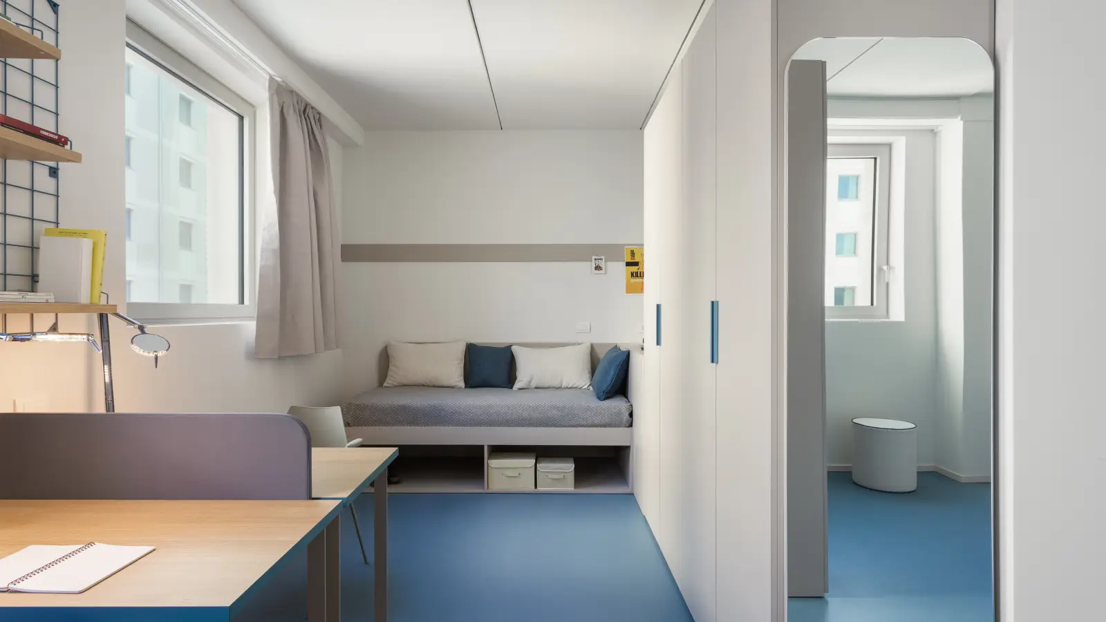Questa camera doppia è progettata per una condivisione intelligente degli spazi senza rinunciare al comfort. Luminosa e ben distribuita, la stanza dispone di due letti singoli, una zona studio doppia e armadi dedicati, garantendo un perfetto equilibrio tra concentrazione e vita quotidiana. Gli ospiti possono usufruire di un bagno privato con doccia, mini-frigo, aria condizionata e Wi-Fi veloce, il tutto in un ambiente completamente arredato.