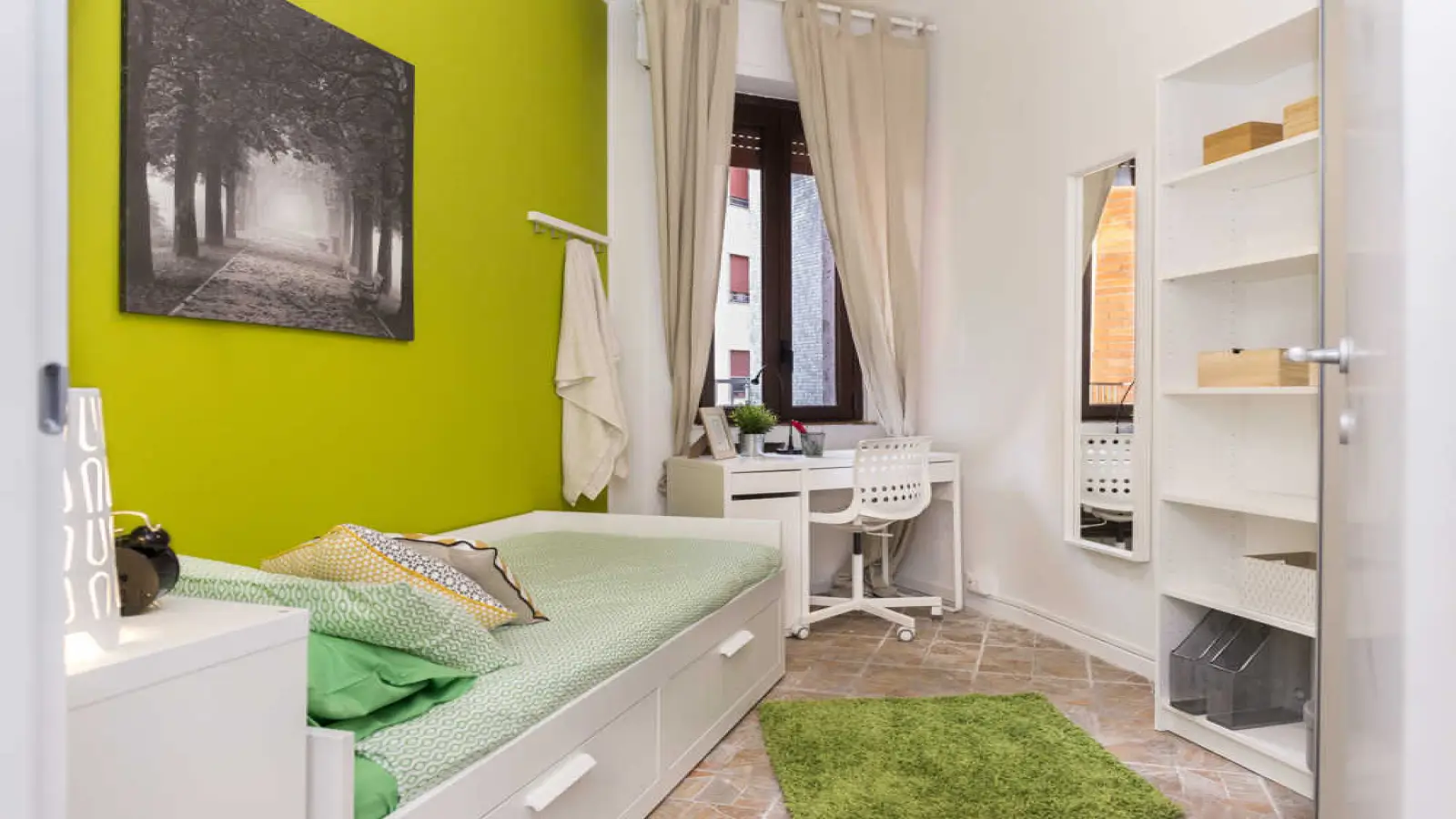 Stanza singola in appartamento condiviso, composto da 3 camere da letto e 1 bagno. Di circa 10 mq con un letto singolo e una postazione di lavoro. Con wifi, servizi di portineria, lavastoviglie, lavatrice. Classe energetica: G, IPE 200,94 Kwh/mq anno.