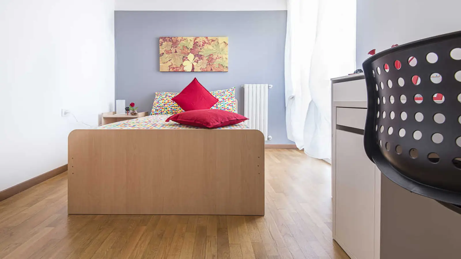 Camera singola in appartamento condiviso, composto da 4 camere da letto e 2 bagni. Di circa 18 mq con un letto singolo e una postazione di lavoro. Con wifi, lavatrice. Classe energetica: C, IPE 79,92 Kwh/mq anno.