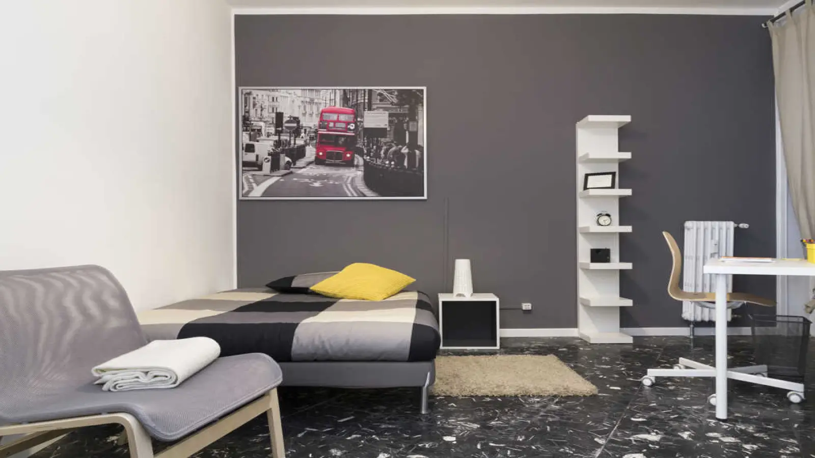 Stanza singola in appartamento condiviso, composto da 4 camere da letto e 2 bagni. Di circa 15 mq con un letto da una piazza e mezza e una postazione di lavoro. Con wifi, servizi di portineria, lavastoviglie, lavatrice. Classe energetica: G, IPE 187,74 Kwh/mq anno.