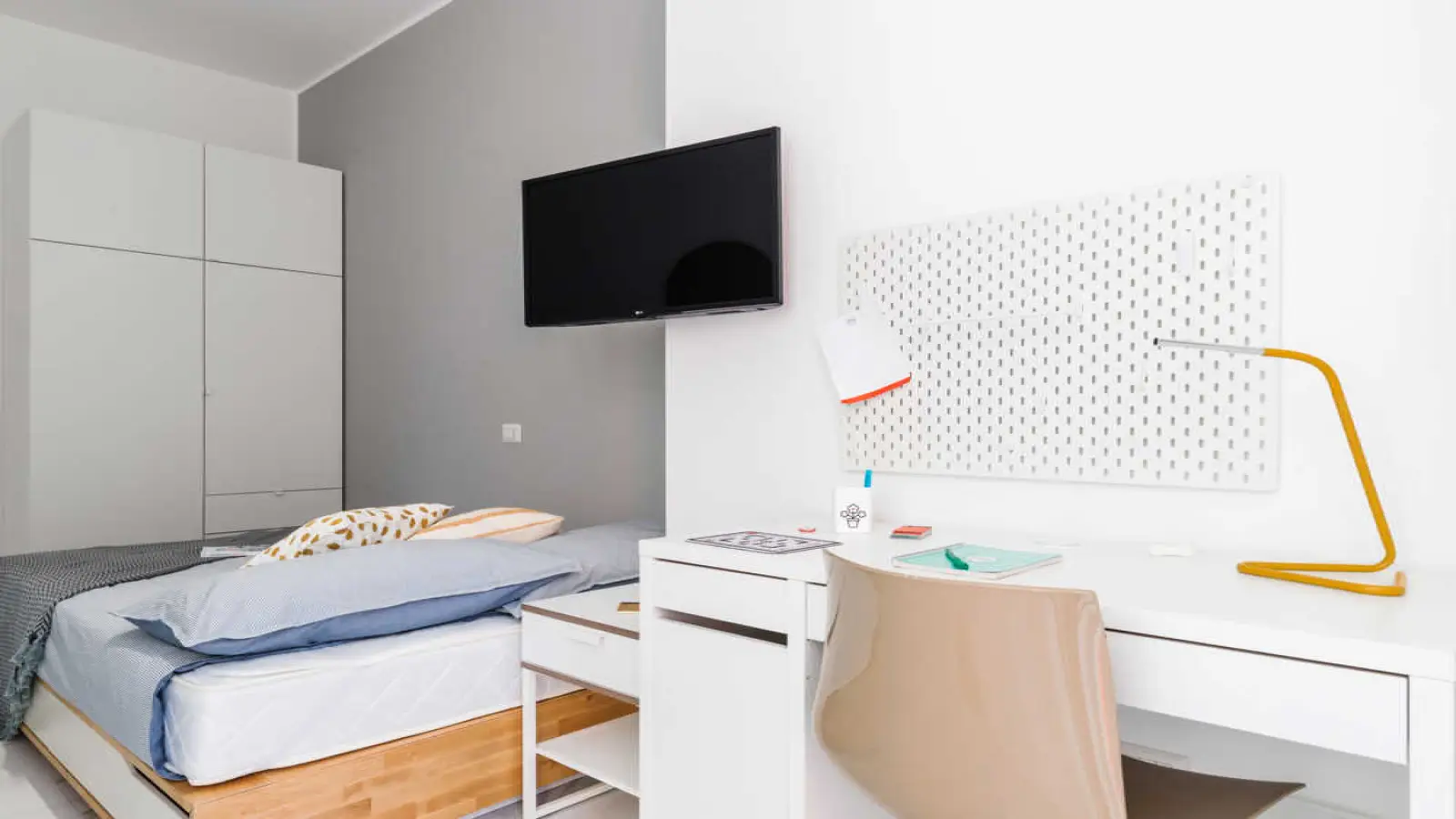 Camera singola in appartamento condiviso, composto da 6 camere da letto e 3 bagni. Di circa 15 mq con un letto a una piazza e mezza e una postazione di lavoro. Con wifi, lavastoviglie, lavatrice. Classe energetica: A, IPE 59,84 Kwh/mq anno.