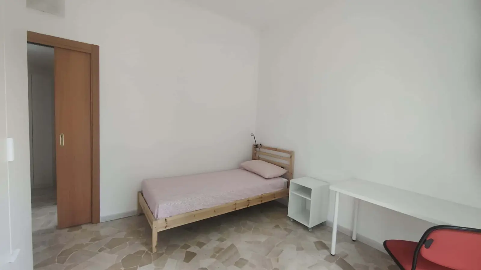 ROOM AND PROPERTY DESCRIPTION Single room in a shared apartment. The room has a area of 19 square meters and includes the following Amenities: desk, bed, closet, and terrace. The apartment has a total area of 54 square meters. In total, the apartment includes two bedroom (one single and one with two beds), one bathroom, and a kitchen equipped with kitchen Kitchenware. The apartment also features of the following services: WiFi, garden, terrace, security door, furniture, elevator, and central heating.