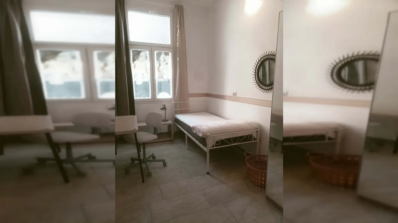 Stanza n. 1, singola con armadio e scrivania in appartamento dove ci sono quattro camere da letto indipendenti e due bagni attrezzati. Ogni camera ha il climatizzatore indipendente, una cassetta di sicurezza e una serratura elettronica, ci sono tende normali e oscuranti.