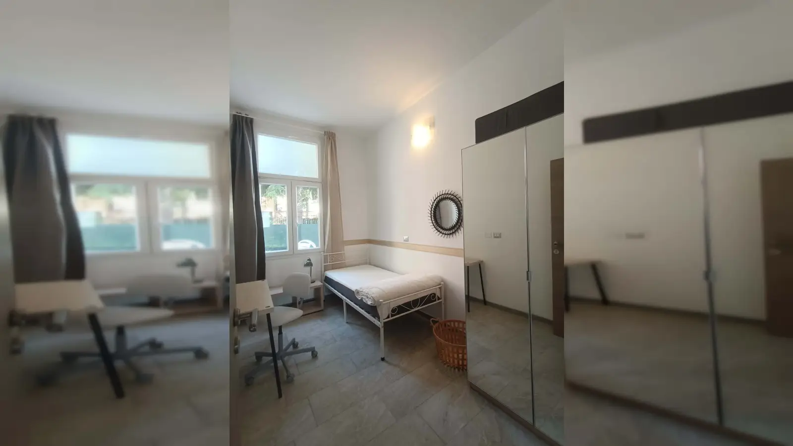 Stanza n.2, singola con armadio e scrivania in appartamento dove ci sono quattro camere da letto indipendenti e due bagni attrezzati. Ogni camera ha il climatizzatore indipendente, una cassetta di sicurezza e una serratura elettronica, ci sono tende normali e oscuranti.