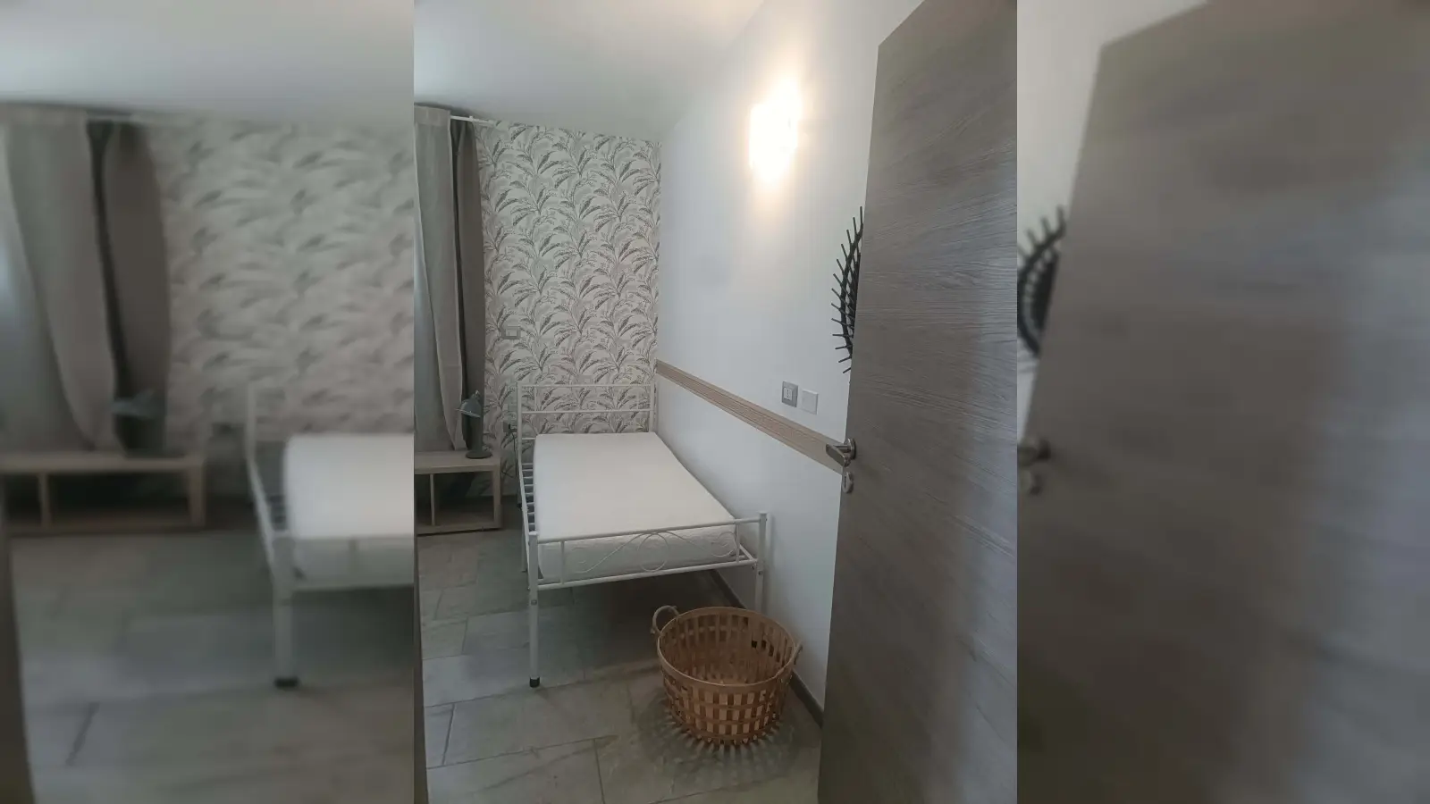 Stanza n. 4, singola con armadio e scrivania in appartamento dove ci sono quattro camere da letto indipendenti e due bagni attrezzati. Ogni camera ha il climatizzatore indipendente, una cassetta di sicurezza e una serratura elettronica, ci sono tende normali e oscuranti.