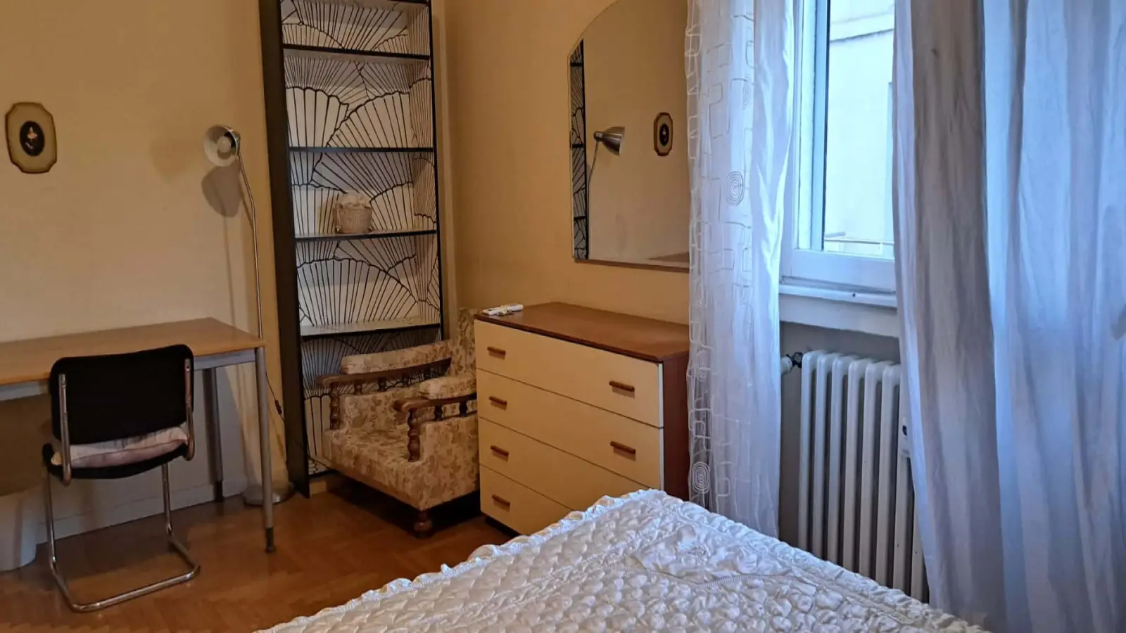 Stanza matrimoniale con scrivania, armadio e cassettone.