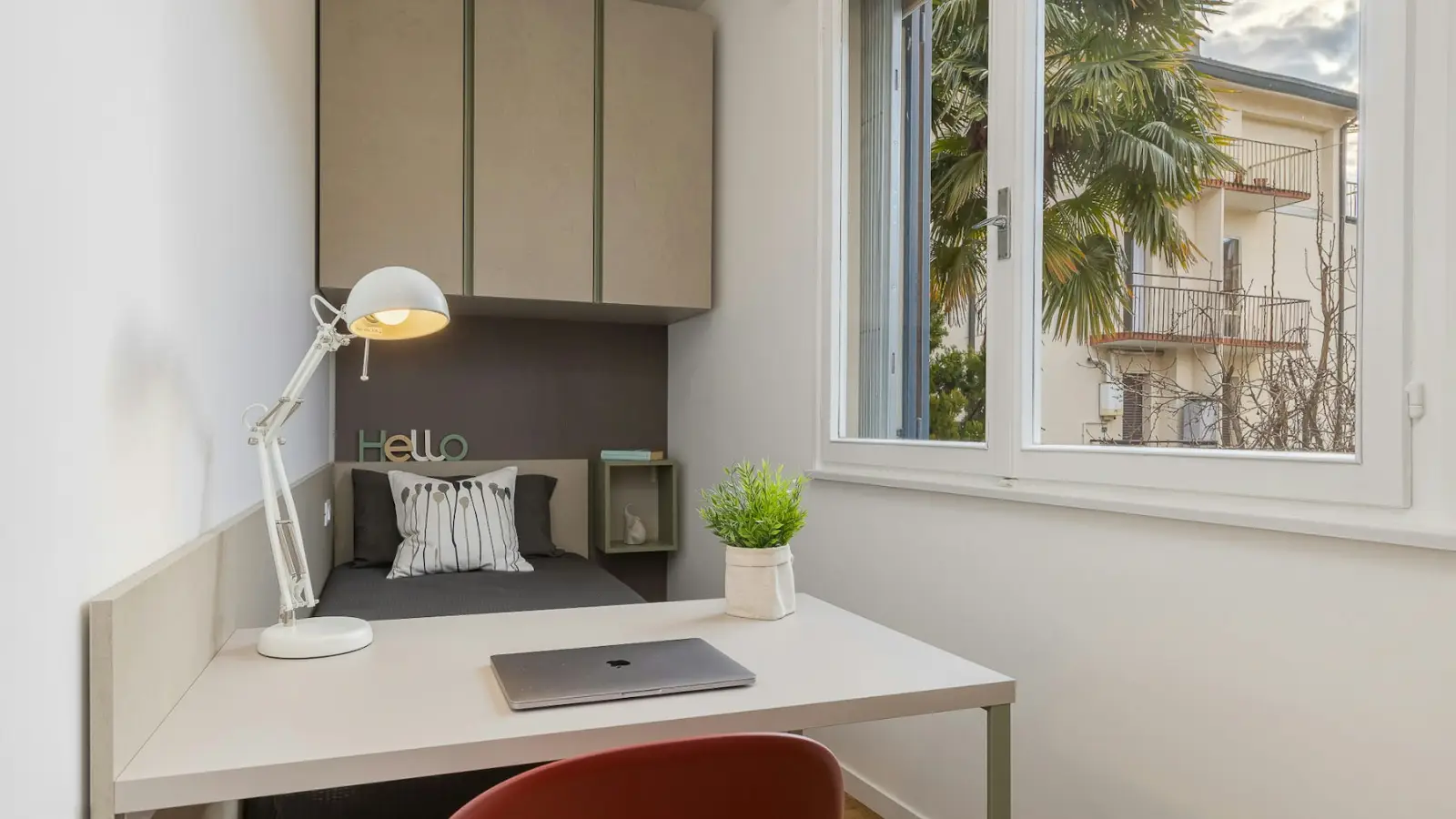 Questa camera singola è pensata appositamente per gli studenti universitari che desiderano un ambiente ideale per studiare e rilassarsi. La particolare disposizione degli spazi crea un'area studio intima e funzionale, ottimizzando al massimo la zona studio. L'ampia scrivania ti permetterà di studiare in tutta comodità, offrendoti spazio a sufficienza per libri e laptop. Per rendere più confortevoli le tue lunghe ore di studio, abbiamo incluso la comoda poltrona Calligaris Basil, progettata specificamente per garantire il massimo comfort anche dopo diverse ore di seduta. Il letto, di dimensioni generose e dotato di rete a doghe, è accompagnato da un materasso ortopedico per assicurarti un riposo rigenerante e confortevole. Potrai dormire come a casa. Per mantenere la tua camera ordinata e organizzata, abbiamo incluso un armadio a due ante con cassetti e ripiani, oltre a un armadio a tre ante a muro. Inoltre, troverai un comodino sospeso per avere sempre a portata di mano tutto ciò di cui hai bisogno durante la notte, come una lampada da lettura o il tuo telefono. Siamo certi che questa camera singola sia la scelta perfetta per te, offrendoti un ambiente funzionale e confortevole, pensato appositamente per gli studenti universitari.