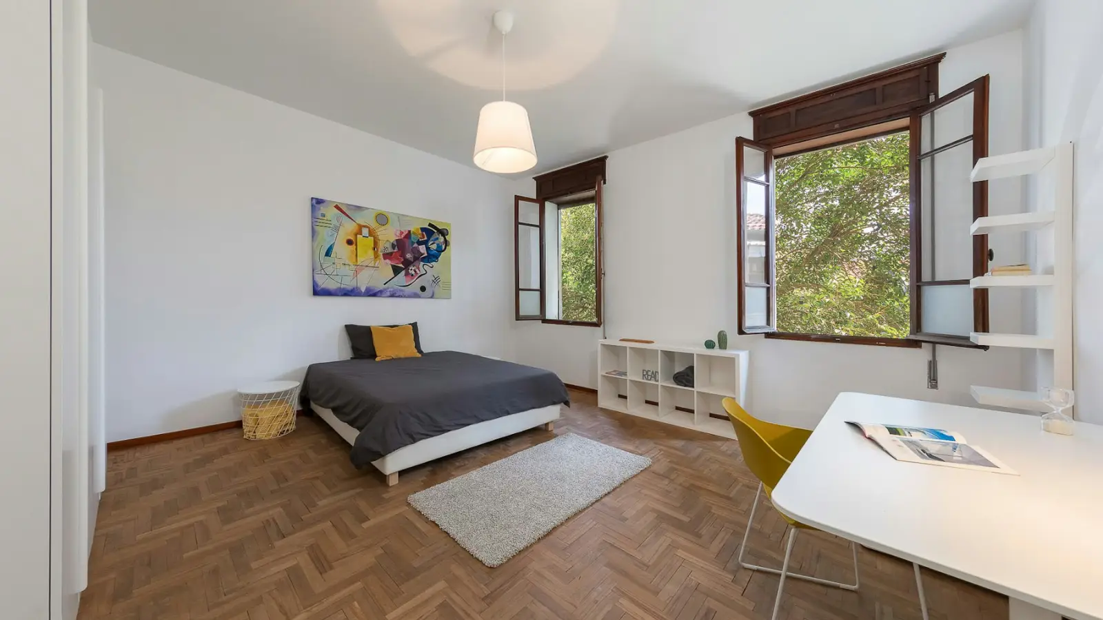 Camera molto spaziosa di 23 m2, appositamente progettata per studenti. Con il suo arredamento minimal, essenziale e total white, questa camera è un perfetto connubio tra personalità e originalità. Il grande armadio a quattro ante ti offre tutto lo spazio necessario per tenere in ordine anche il guardaroba più grande. La spaziosa scrivania (80x160 cm) ti offre uno spazio ideale per studiare, con la sedia Babila Pedrali dal design ergonomico, che non affatica la schiena nemmeno durante le sessioni di studio più intense. Abbiamo incluso una libreria che aggiungerà un tocco di classe alla tua stanza. Potrai esporre i tuoi libri preferiti e i tuoi oggetti, creando un'atmosfera unica e personale. Una bacheca ti aiuterà a tenere traccia dei tuoi impegni e delle tue ispirazioni.