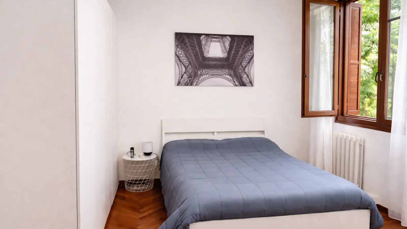 Camera singola dallo stile essenziale per studenti che cercano una soluzione comoda e funzionale in centro città. Dotata di letto matrimoniale con testiera moderna e materasso ortopedico che assicura un riposo completo, due eleganti comodini, un ampio armadio a 4 ante con cassettiera e una postazione studio completa di scrivania e comoda sedia girevole per trascorrere ore a studiare davanti al PC senza stancarsi.
