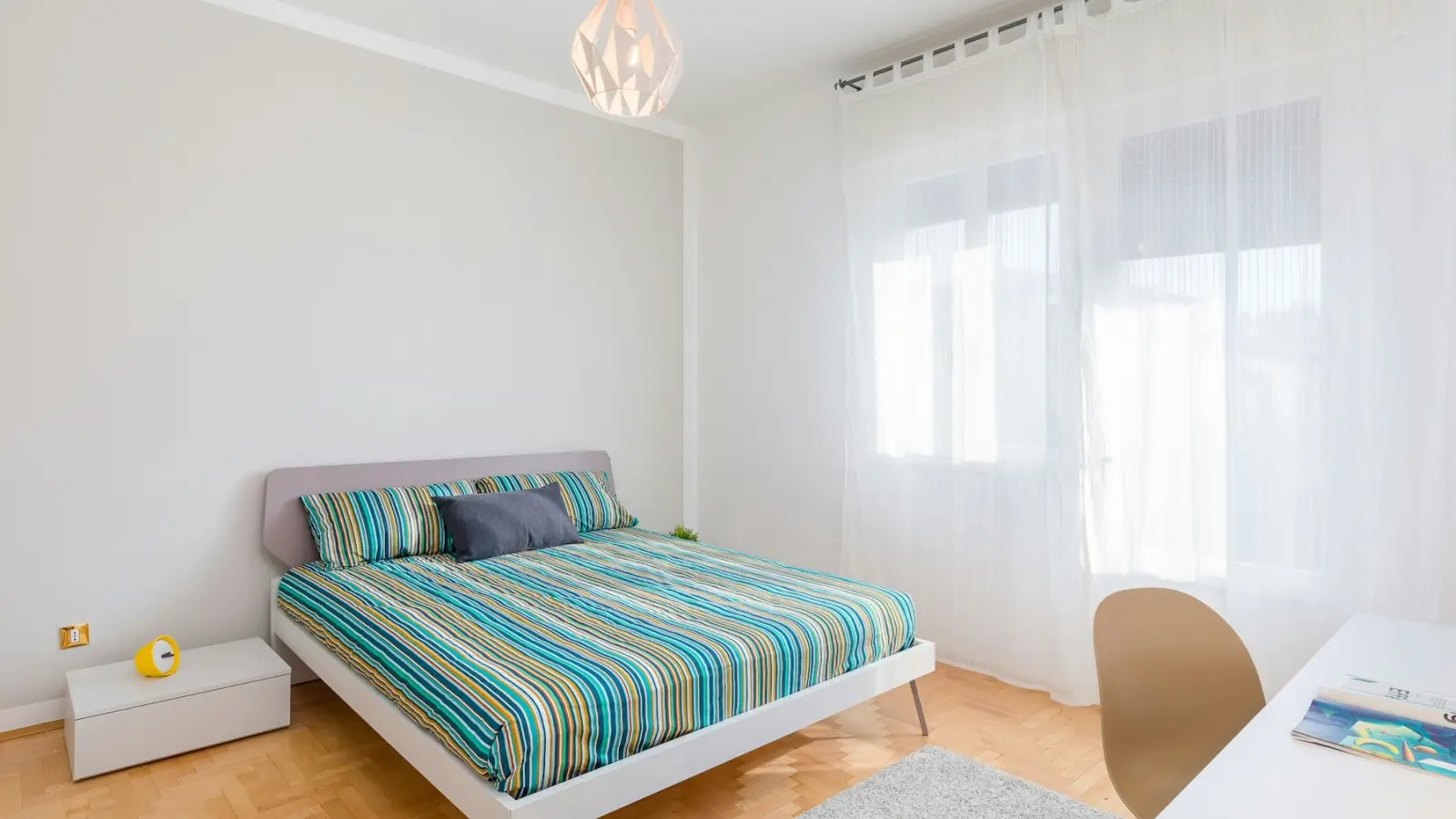Ogni dettaglio di questa camera, come dell'intero appartamento, è pensato per offrire un'esperienza di soggiorno estremamente piacevole. L'arredamento coniuga funzionalità e design, con elementi scelti per massimizzare il comfort. L'illuminazione è stata accuratamente selezionata per creare un ambiente calmo e rilassante, ideale per il riposo. La sedia, progettata per prevenire il mal di schiena, garantisce il massimo comfort anche durante lunghe ore di seduta. Il letto matrimoniale, dallo stile minimalista, è completato da un materasso di alta qualità che garantisce un sonno ristoratore. Completa la camera un capiente armadio a tre ante, perfetto per tenere in ordine il guardaroba e mantenere l'ambiente sempre impeccabile.