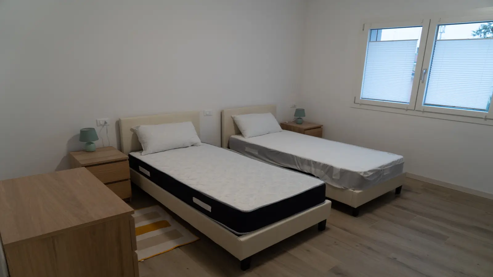 Questa accogliente camera privata, situata in un appartamento condiviso con 5 camere da letto a Voltabarozzo, è completamente arredata e dispone di due letti singoli, scrivania, cassettiera, armadio a muro e finestra con vista sul patio interno. La camera include una chiave indipendente ed è ideale per single o coppie. L'appartamento offre anche l'accesso a un giardino e a una sala comune con TV.