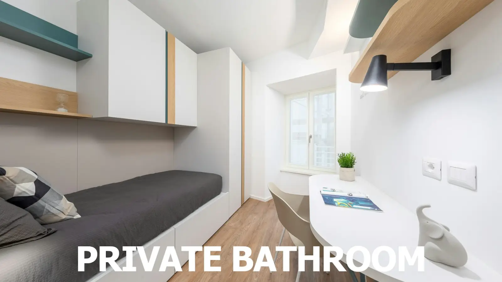 Minerva Student Hotel - Studia, vivi, scopri! 24 studenti, 24 camere singole con bagno, a 2 passi dalle facoltà. Questa confortevole camera unisce la privacy di un ambiente esclusivo a tutti i servizi di una residenza esclusivamente per studenti. Pensata per le esigenze di chi deve trascorrere molte ore a studiare, ha una spaziosa scrivania con una bella lampada, una sedia per una comoda lettura, una libreria e un ampio armadio con cassettiera interna.