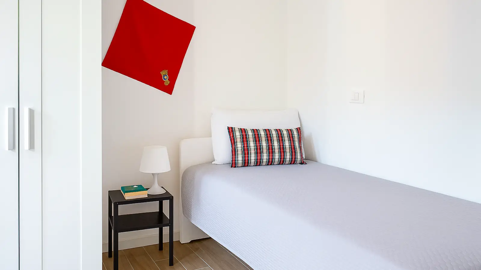 Camera ben organizzata e funzionale, ideale per studenti o giovani professionisti. La camera è arredata con un letto singolo, un pratico comodino per gli oggetti personali, un armadio a due ante per una gestione efficiente dello spazio e una scrivania con sedia, perfetta per studiare o lavorare. Questo spazio è ottimizzato per garantire comfort e praticità in un ambiente ordinato e accogliente.