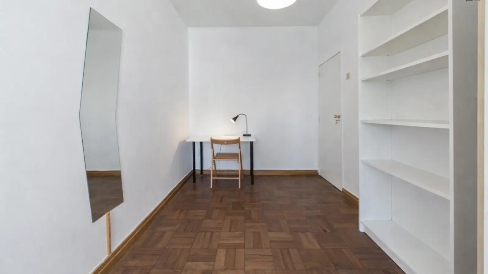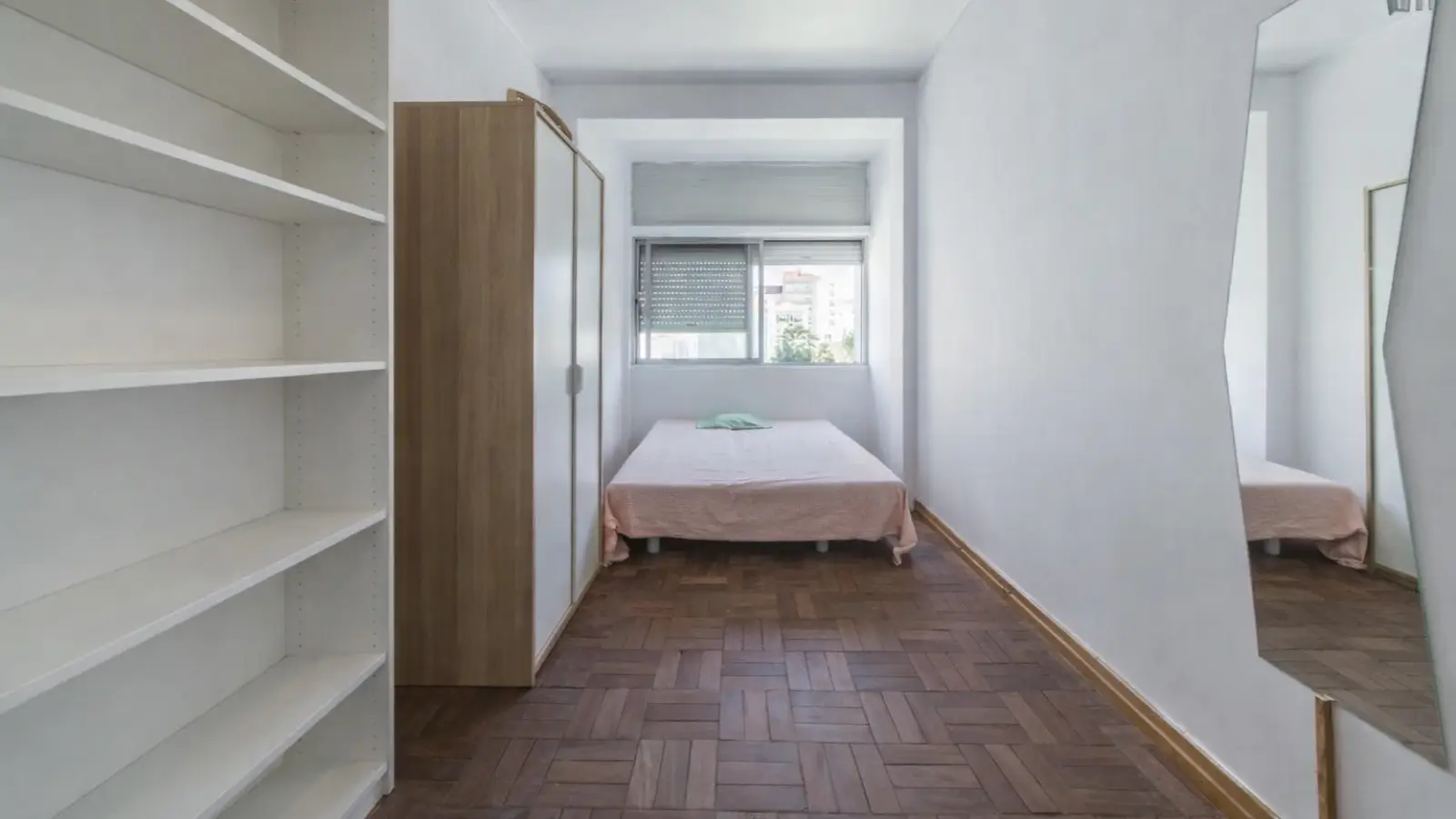 Bedroom 5 is a big and bright room furnished with a double bed, desk, shelving, and a standalone wardrobe.