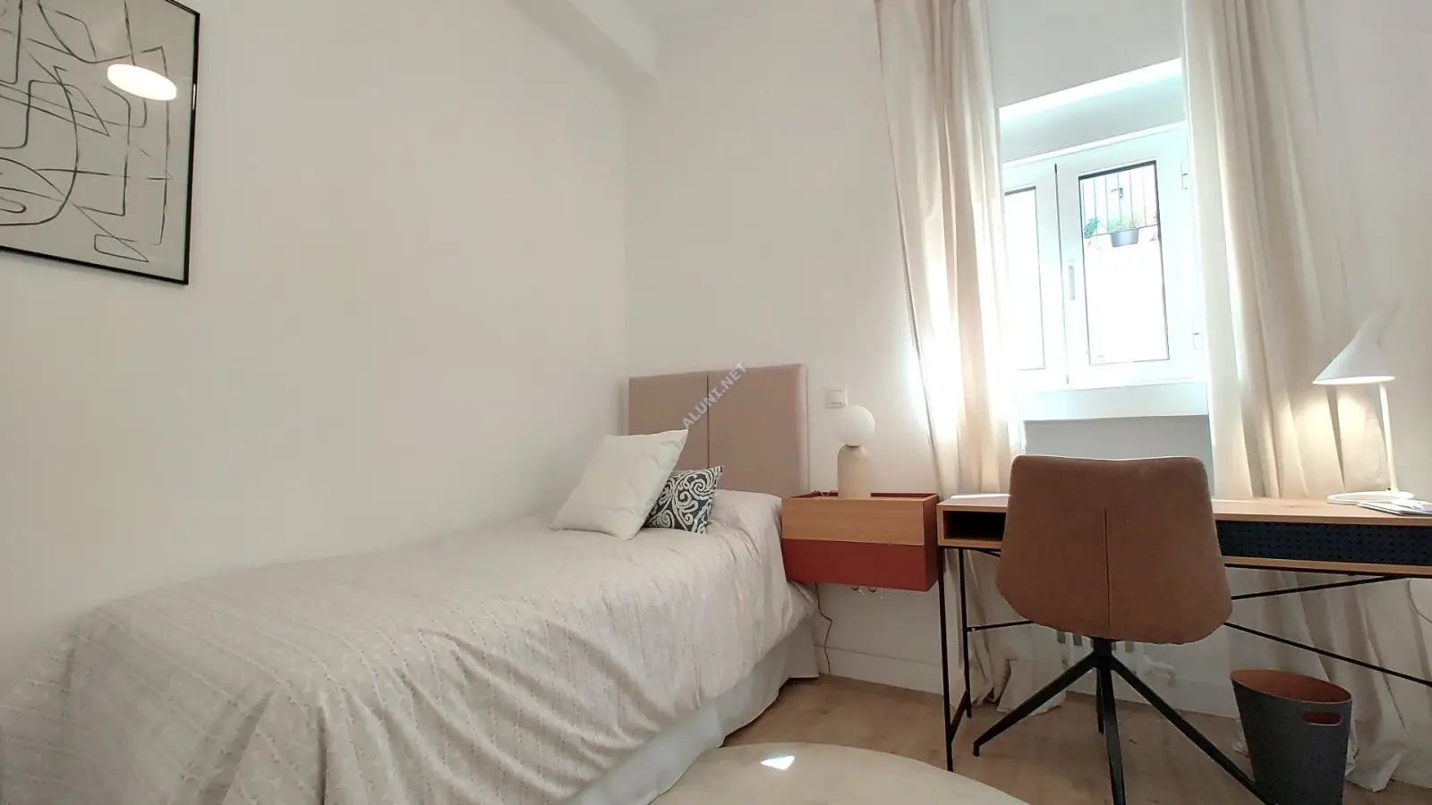 This furnished room is located in a shared 8-bedroom apartment in Argüelles, a vibrant neighbourhood of Madrid. The apartment features amenities including individual air conditioning units and central building heating to ensure comfort throughout the year. The equipped kitchen comes complete with modern appliances, such as a dishwasher, oven, and a washer. High-speed WiFi is included, enhancing convenience for tenants. The apartment building also has an elevator for easy access. This room offers a cozy and functional space within a large shared apartment, ideal for individuals looking for comfort and city convenience.