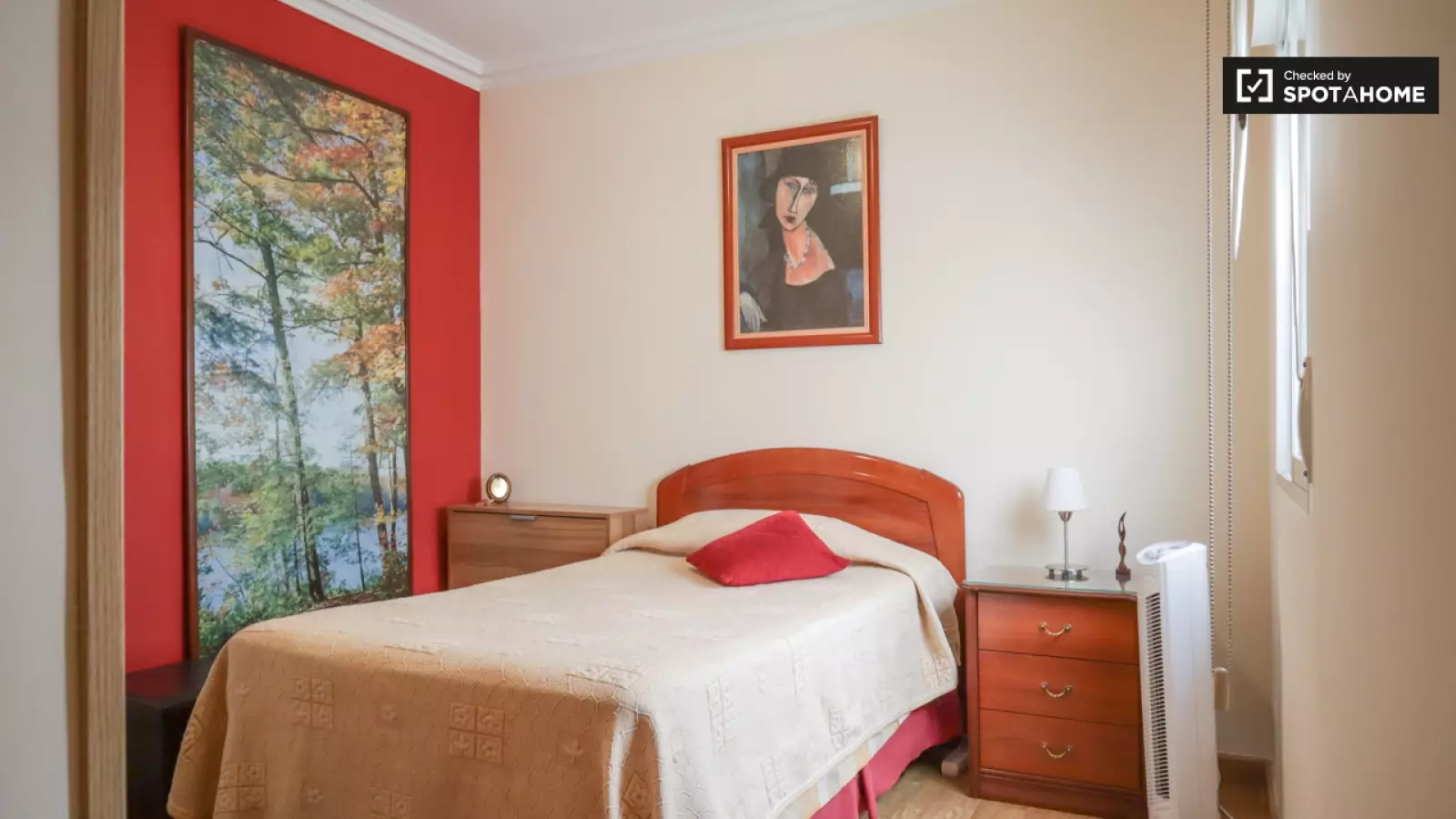 This is an exterior room in a shared 3-bedroom apartment, located in the vibrant Quintana neighborhood of Madrid. Fully furnished and equipped, this property includes amenities such as a private washing machine, a dishwasher, an oven, a TV, and individual air conditioning units. The kitchen is equipped, and you can enjoy a balcony or terrace for relaxation. Please note, this property is exclusive to male tenants, who must be professionals or students.