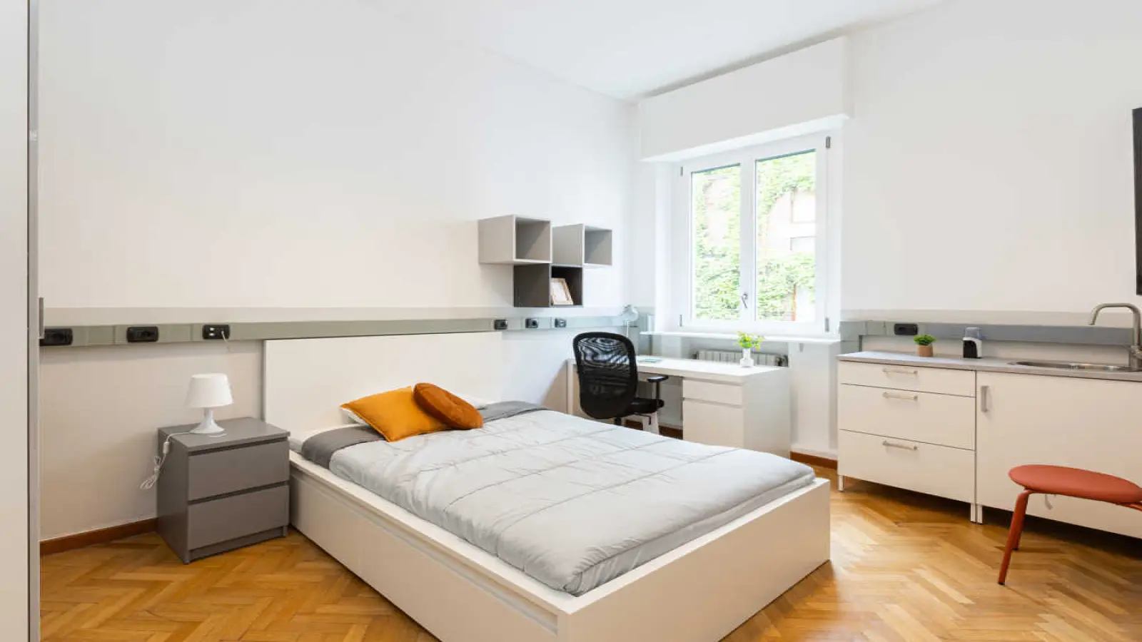 Single room in a shared apartment, composed by 5 bedrooms and 2 bathrooms. Of about 16 sqm with a single bed and a work station. With wifi, bike parking, dishwasher, washing machine. Energy class: F, IPE 186.22 Kwh/Sqm year.