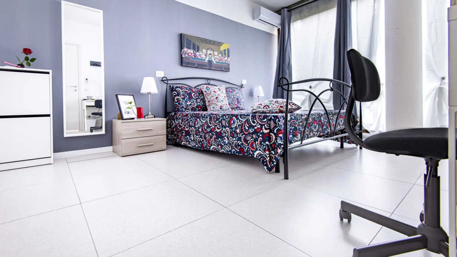 Single room in a shared apartment, composed by 6 bedrooms and 0 bathroom. Of about 11 sqm with a double bed and a work station, A private bathroom complete the opportunity. With wifi, air conditioning, washing machine. Energy class: B, IPE 145.89 Kwh/Sqm year.