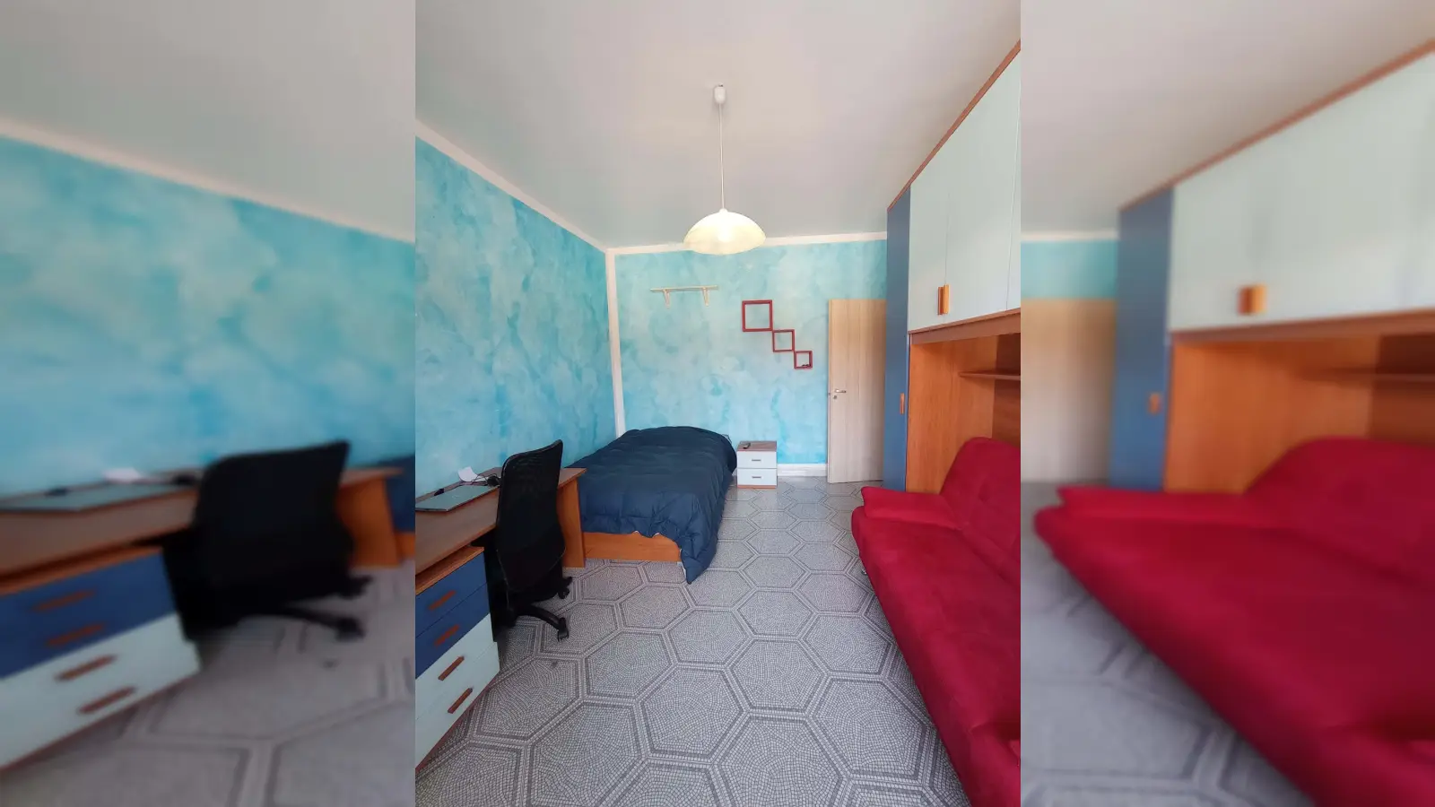 La stanza è molto spaziosa (20 mq) e completamente arredata con: letto da una piazza e mezza francese con comodo materasso a molle insacchettate, divano letto da una piazza e mezza, ampio armadio, scrivania, libreria e TV. Ideale per chi cerca comfort e funzionalità in un ambiente spazioso e luminoso.