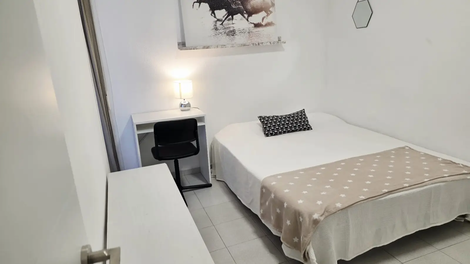 The room is well-equipped, with a window that provides natural light. Located on the ground floor, the home stays pleasantly cool in summer. It also has a private radiator for warmth in winter. Storage won’t be an issue thanks to a three-door wardrove and shelves. You will also have access to a wide range of services such as supermarkets, restaurants and post office, among others.