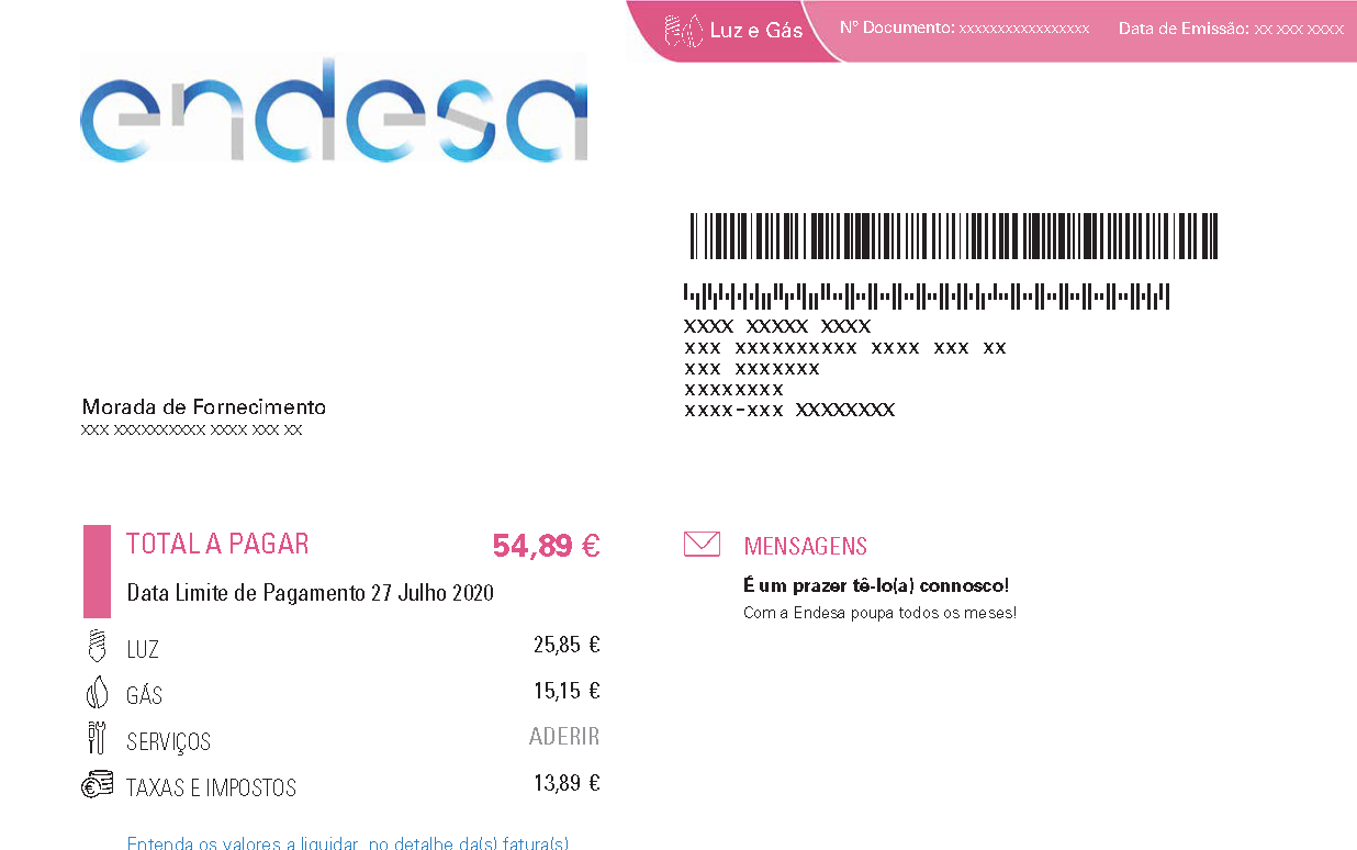 Deverá ainda conseguir perceber, de forma clara, a distribuição do valor a pagar por consumos das diversas componentes, isto é: quanto pagará por eletricidade, gás, serviços e taxas e impostos. No fundo, este será um resumo da sua fatura. Logo depois encontrará, à partida, o total a pagar, bem como a data-limite de pagamento da sua fatura e os dados para a poder pagar. Encontrará também explicado o que pode acontecer se não pagar.