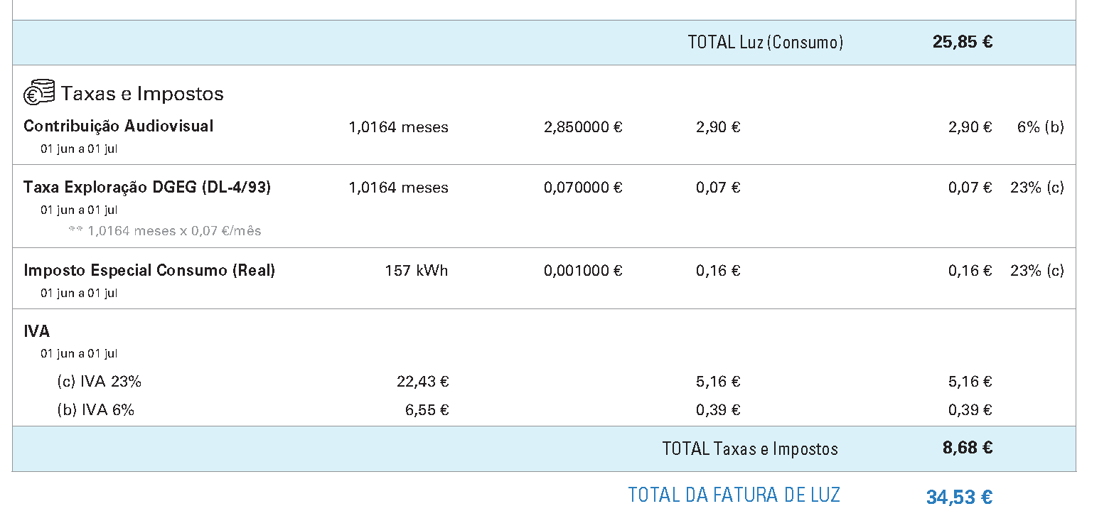- Imposto Especial de Consumo de Eletricidade: este imposto foi criado pelo Estado, e é aplicado pelas companhias fornecedoras de eletricidade. É fixo, e em Portugal corresponde a 0,001€ por kWh.