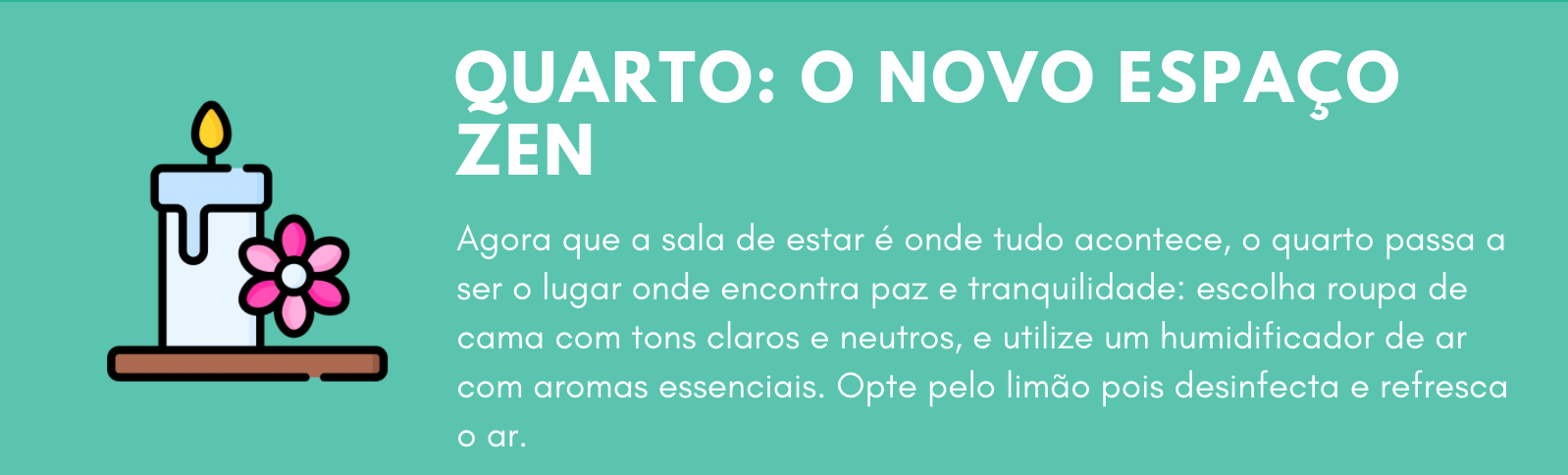 O quarto: aqui sou a favor de evitar o excesso de elementos para criar aquela sensação de limpeza e paz que tanto precisamos agora. A cor também é importante portanto, na medida do possível, usar tons claros para almofadas e roupa de cama para ajudar a criar uma atmosfera que convida ao descanso e reflete tranquilidade, espiritualidade e harmonia. Um umidificador de ar com óleos essenciais de limão não só nos ajuda a respirar e a dormir melhor, mas também o óleo essencial de limão servirá como desinfetante natural. Ventile o quarto diariamente e deixe o sol, um ótimo desinfetante natural, entrar todas as manhãs em nossa casa.