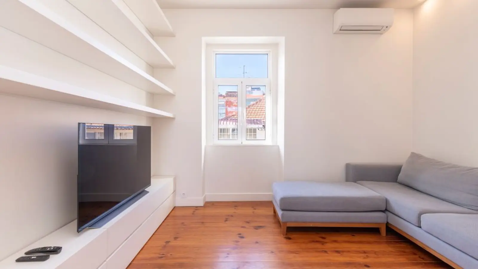 Sala de Estar Iluminada – Decoração minimalista, muita luz natural e um ambiente acolhedor, ideal para relaxar após um dia na cidade.