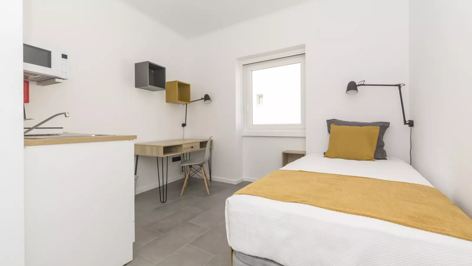 Apartamento estúdio mobiliado para alugar na TV. Irmãzinhas Dos Pobres. A propriedade fica no 2º andar. A propriedade inclui mesa, banheiro privativo e cozinha compacta.