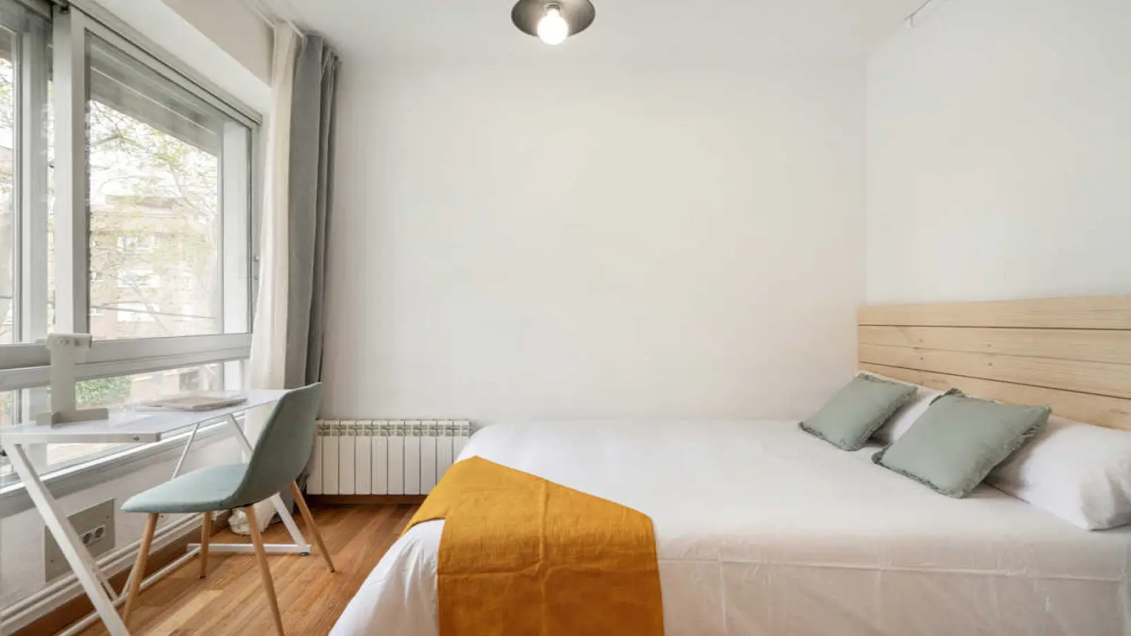 Quarto individual em apartamento compartilhado, composto por 10 quartos e 3 banheiros. De cerca de 12 m² com uma cama de casal e uma estação de trabalho. Com wifi, ar condicionado, piscina, jardim, lava-louças, máquina de lavar roupa. Classe energética: G, IPE 0,00 Kwh/m² ano.