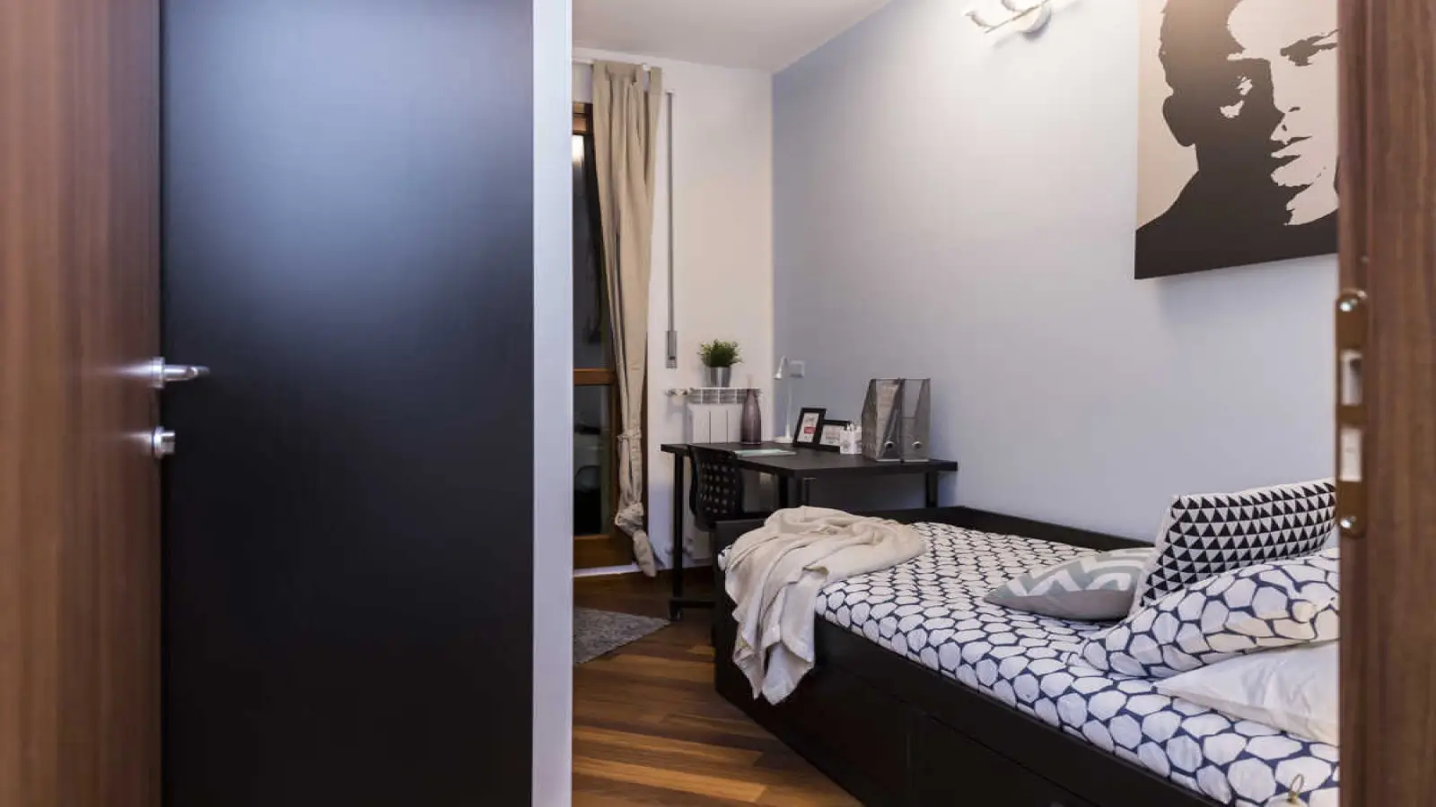Quarto individual em apartamento compartilhado, composto por 6 quartos e 3 banheiros. De cerca de 9 m² com uma cama de solteiro e uma estação de trabalho. Com wifi, ar condicionado, lava-louças, máquina de lavar roupa. Classe energética: B, IPE 33,59 Kwh/m² ano.