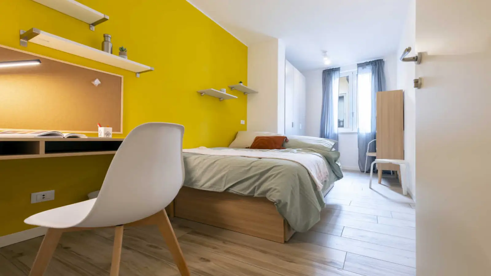Quarto individual em apartamento compartilhado, composto por 7 quartos e 3 banheiros. Com aproximadamente 14 m², com uma cama de solteiro e uma estação de trabalho. Com Wi-Fi, bicicletário e lava-louças. Classe energética: A, IPE 52,22 kWh/m² ano.
