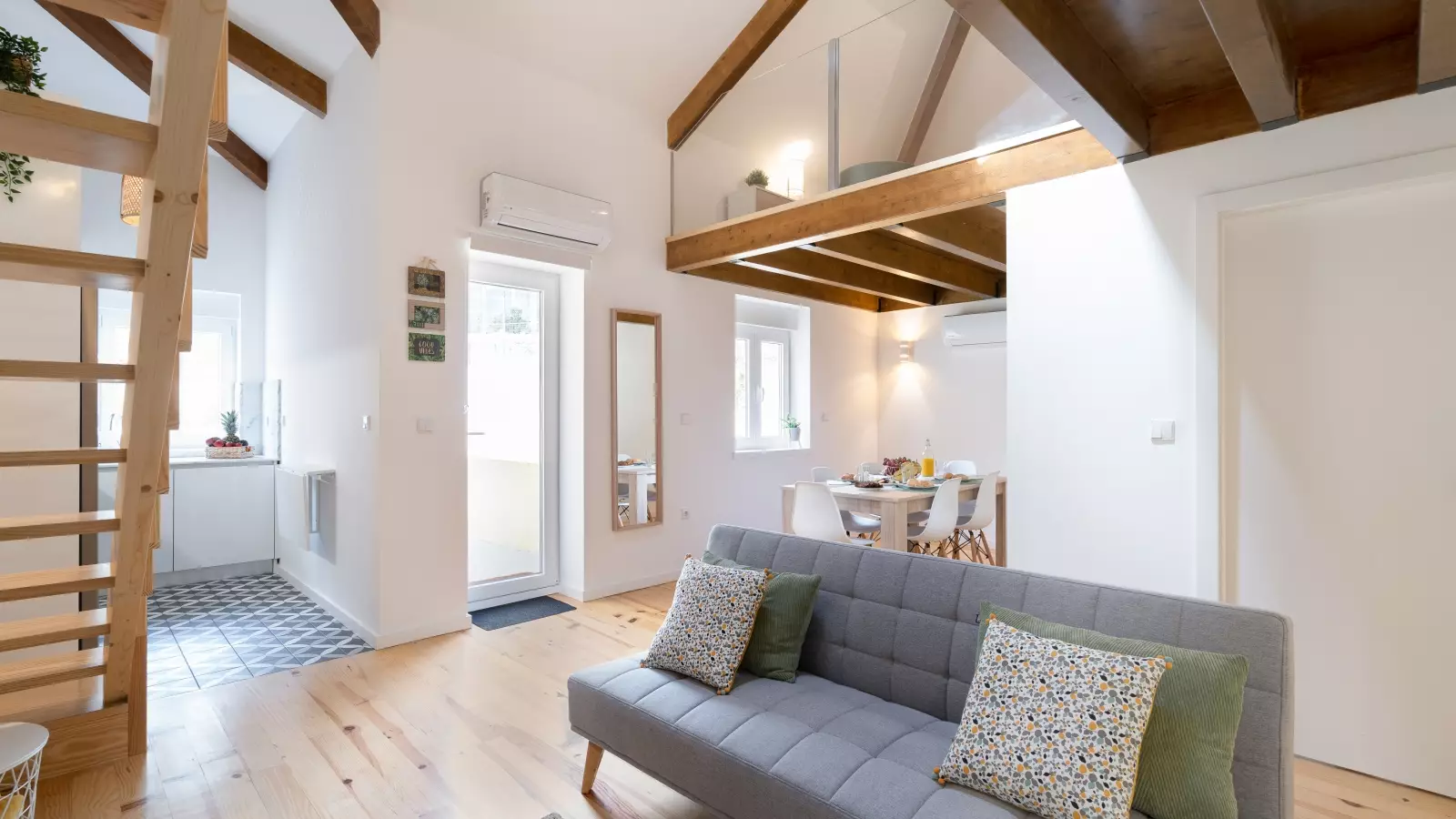 Apartamento duplex mobiliado de 2 quartos para alugar A propriedade inclui terraço e TV.