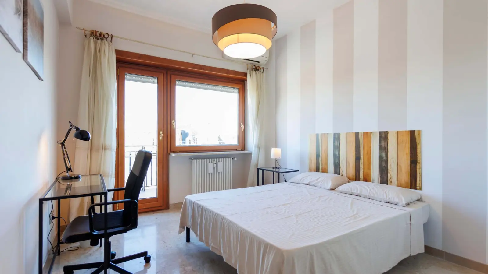 Um quarto individual de 14 m² totalmente mobiliado para Apartamento para alugar, equipado com cama, escrivaninha e guarda-roupa, localizado em um espaçoso apartamento de 140 m² no 10º andar com elevador, na Via Padre Semeria. O apartamento dispõe de 5 quartos, 2 banheiros, cozinha com sala de estar e varanda acessível por todos os cômodos. A varanda oferece uma vista panorâmica deslumbrante de Roma, incluindo o Gasômetro, a Cúpula de São Pedro, as Muralhas Aurelianas e a colina Castelli Romani.