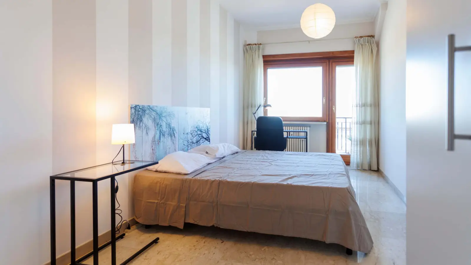 Um quarto individual de 14 m² totalmente mobiliado para Apartamento para alugar, equipado com cama, escrivaninha e guarda-roupa, localizado em um espaçoso apartamento de 140 m² no 10º andar com elevador, na Via Padre Semeria. O apartamento dispõe de 5 quartos, 2 banheiros, cozinha com sala de estar e varanda acessível por todos os cômodos. A varanda oferece uma vista panorâmica deslumbrante de Roma, incluindo o Gasômetro, a Cúpula de São Pedro, as Muralhas Aurelianas e a colina Castelli Romani.