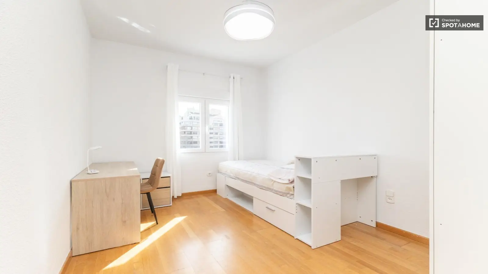 Descubra este quarto em um apartamento compartilhado de 4 quartos localizado em Mestalla, Valência. A propriedade está totalmente mobiliada, possui ar-condicionado central e está equipada com máquina de lavar roupa privativa, decoração interna e TV. Foi verificada pela Spotahome, garantindo a confiabilidade do proprietário. Observe que casais não são permitidos.