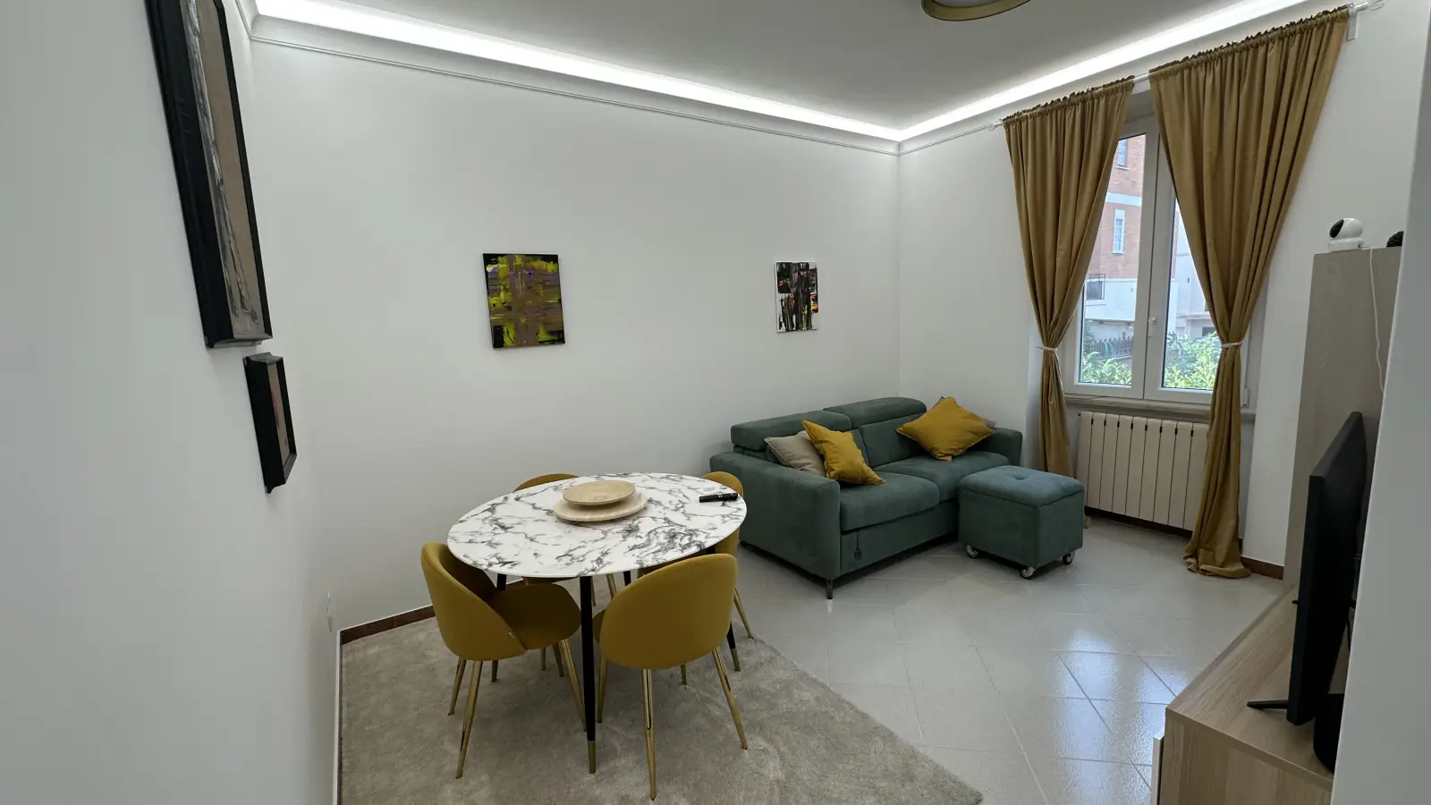 This furnished 1 bedroom flat in La Pisana, Rome, comes with a fully equipped kitchen showcasing a dishwasher and oven for your culinary needs. It also includes a natural gas water heating system and features individual air conditioning units.