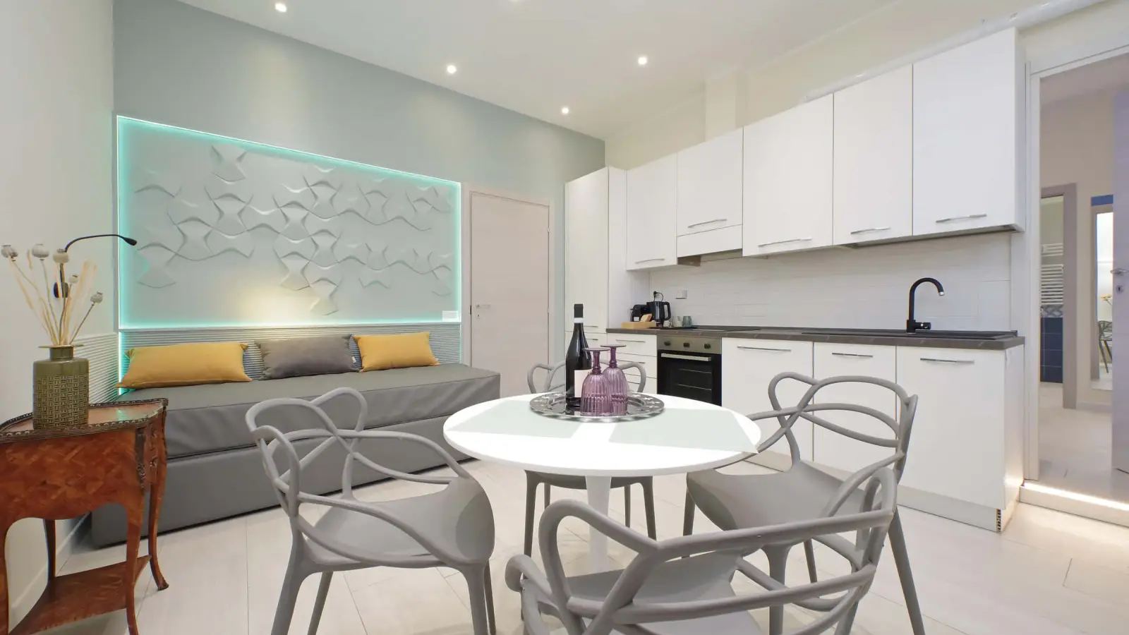 L’appartamento è completamente arredato e offre tutti i comfort moderni: WiFi, aria condizionata, riscaldamento centralizzato, lavatrice, portone blindato e sistema di allarme.