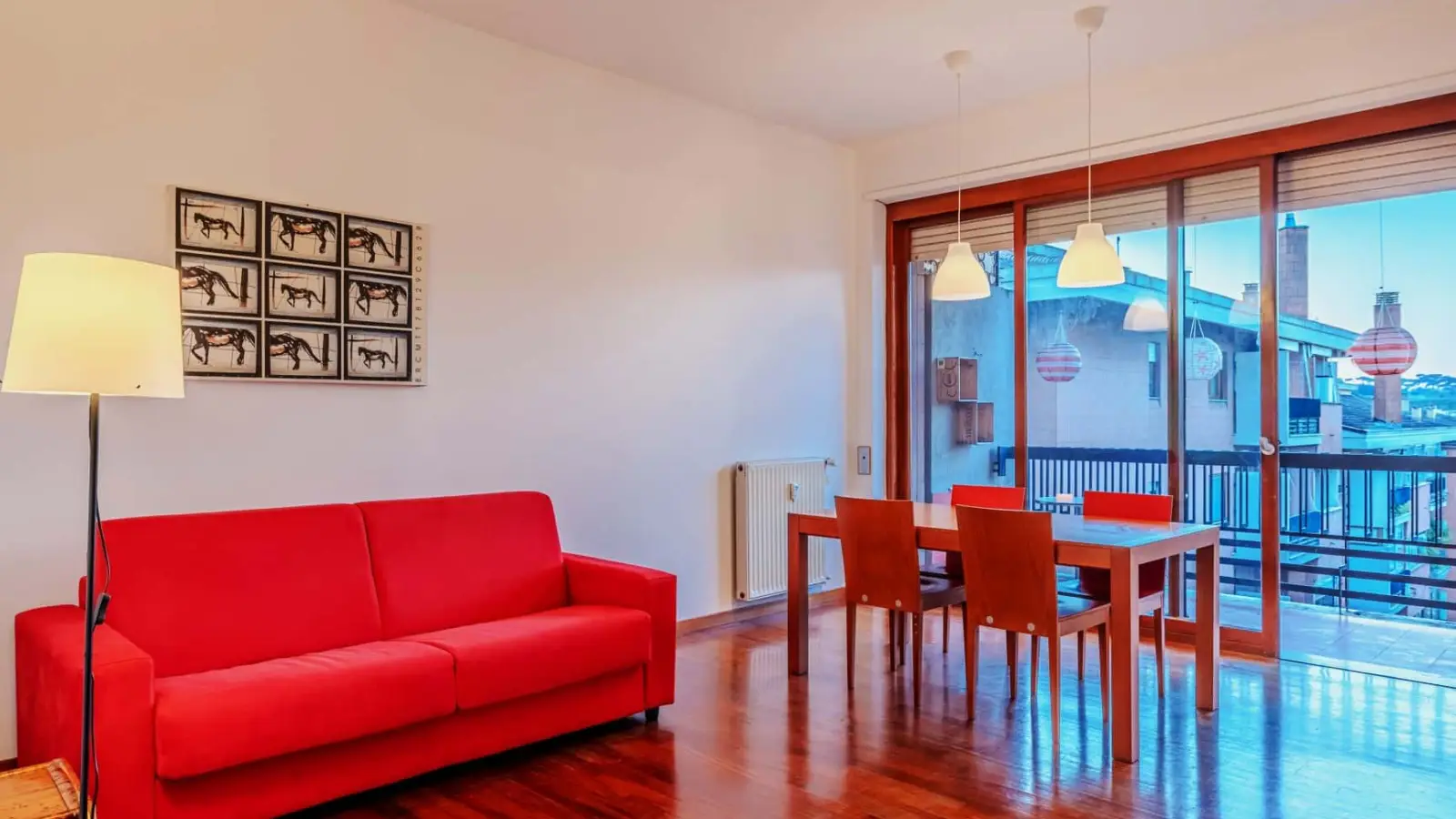 L’alloggio è composto da un’ampia sala living con zona pranzo e comodo divano letto doppio, due camere da letto di cui una con cabina armadio, un bagno completo con vasca, una cucina completamente attrezzata, due terrazze e un balcone.