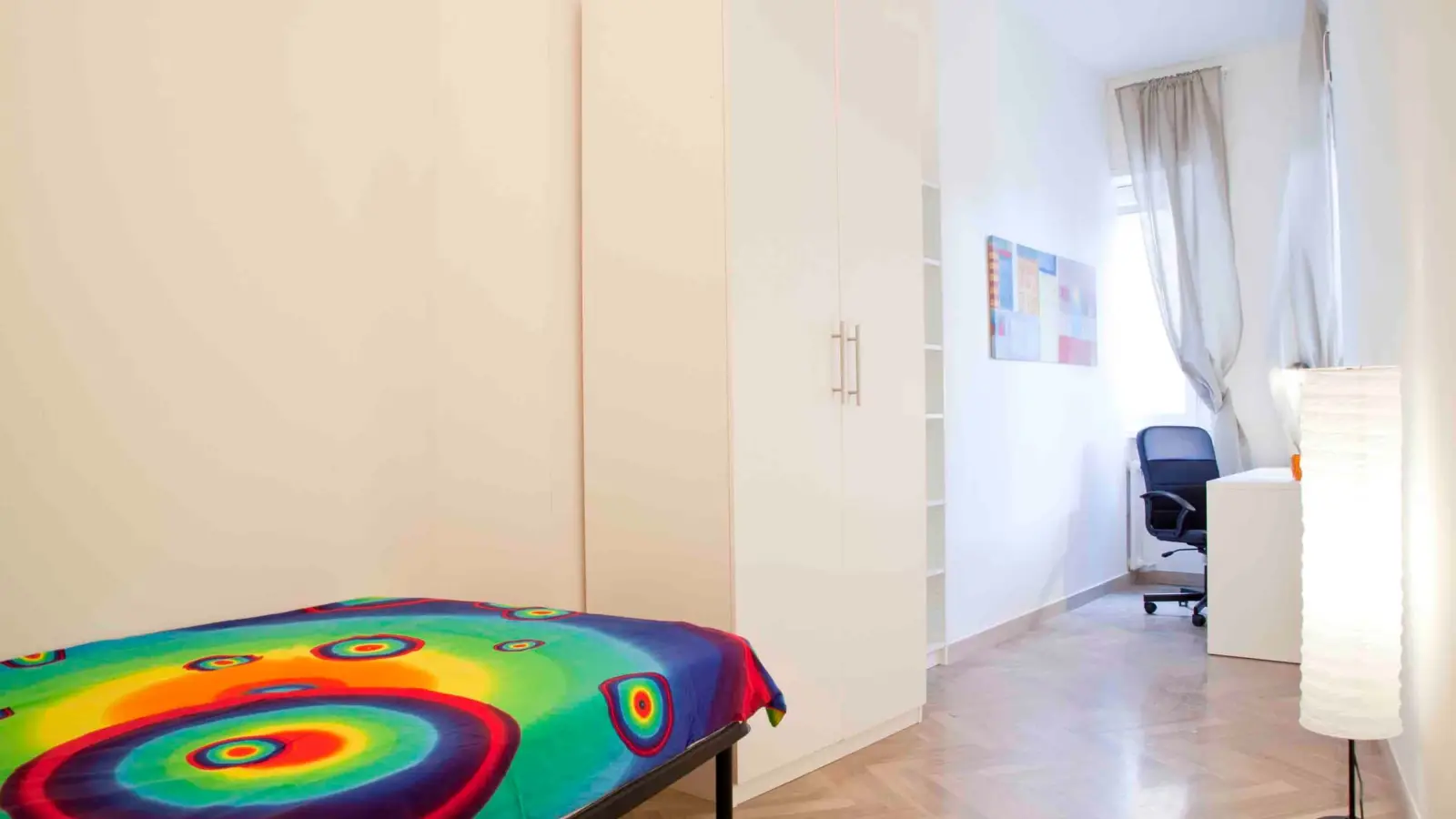 Stanza luminosa di 12 mq con letto, scrivania e armadio, situata al piano terra di un grande appartamento di 140 mq composto da 5 camere, due bagni e un soggiorno con angolo cottura.