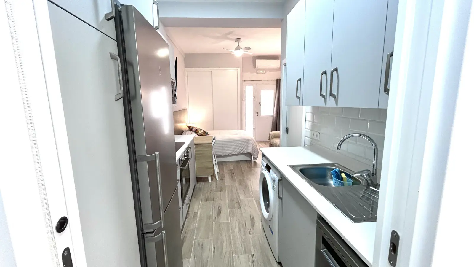 Looking for a comfortable studio in Los Remedios, Seville? This furnished studio welcomes professionals and students, with amenities such as individual air conditioning units, an equipped kitchen with dishwasher and oven, and access to a common washing machine. It has been personally verified by Spotahome, ensuring landlord reliability.
