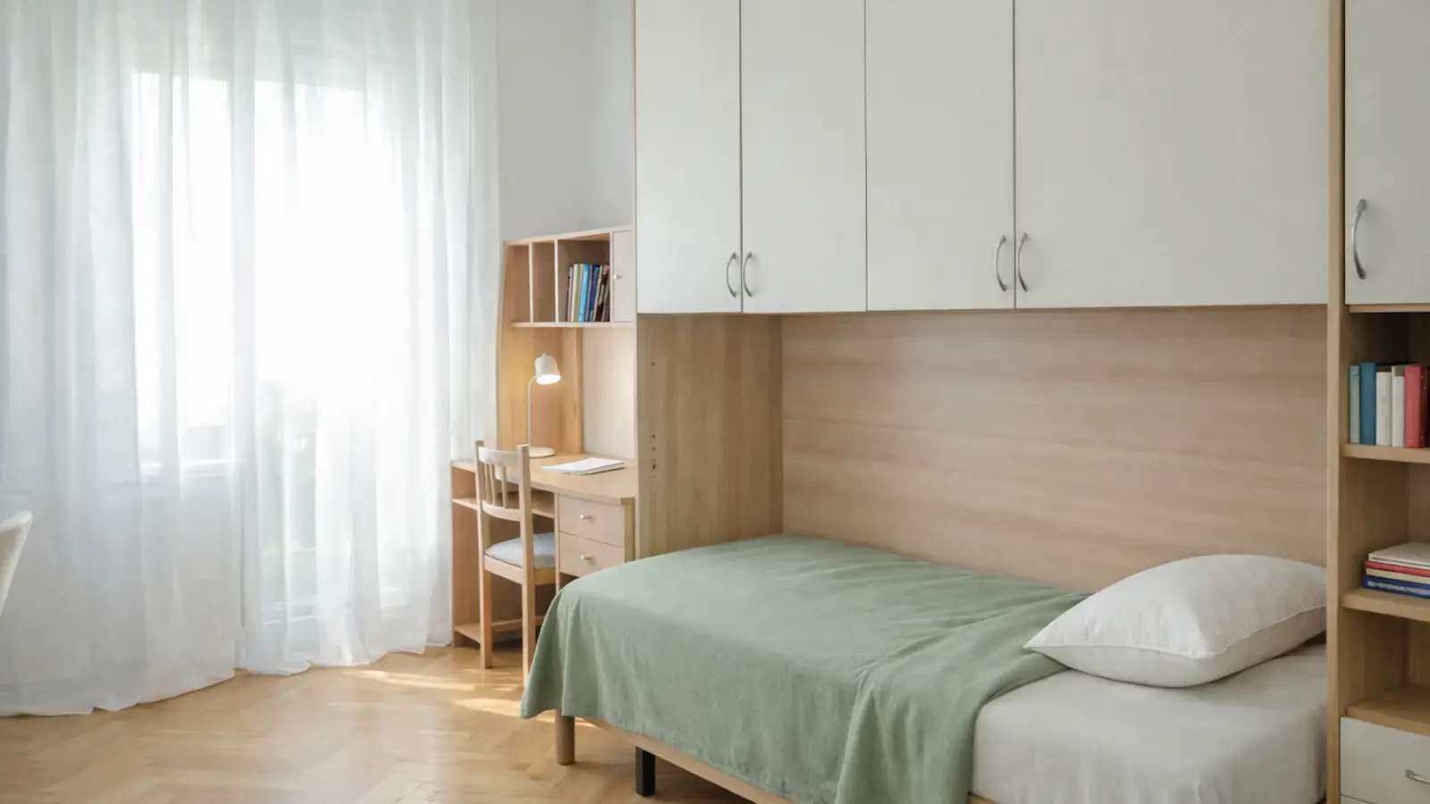 A room to meet the needs of those looking for a simple room but specifically designed for students. The room is furnished with a single bed framed by a bridge wardrobe that is perfect for storing clothes, books and to keep the room tidy. The study station is perfectly lit and consists of a desk with simple lines and a comfortable chair.