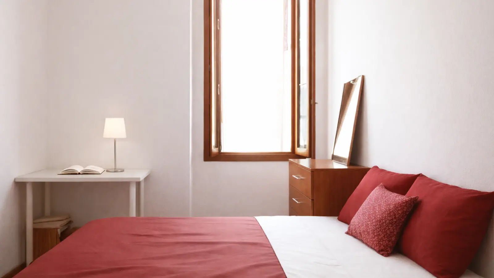 Bright single room with a minimal and essential style, characterized by a double bed.