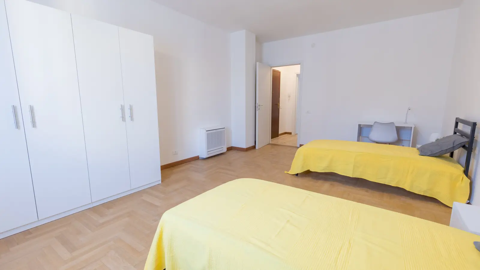 Welcome to a cozy room in a shared 4-bedroom apartment in Vicenza. This accommodation is furnished, with central heating, individual air-conditioning units, and a communal washing machine. Also, a fully equipped kitchen is available for your use, ensuring convenience during your stay.