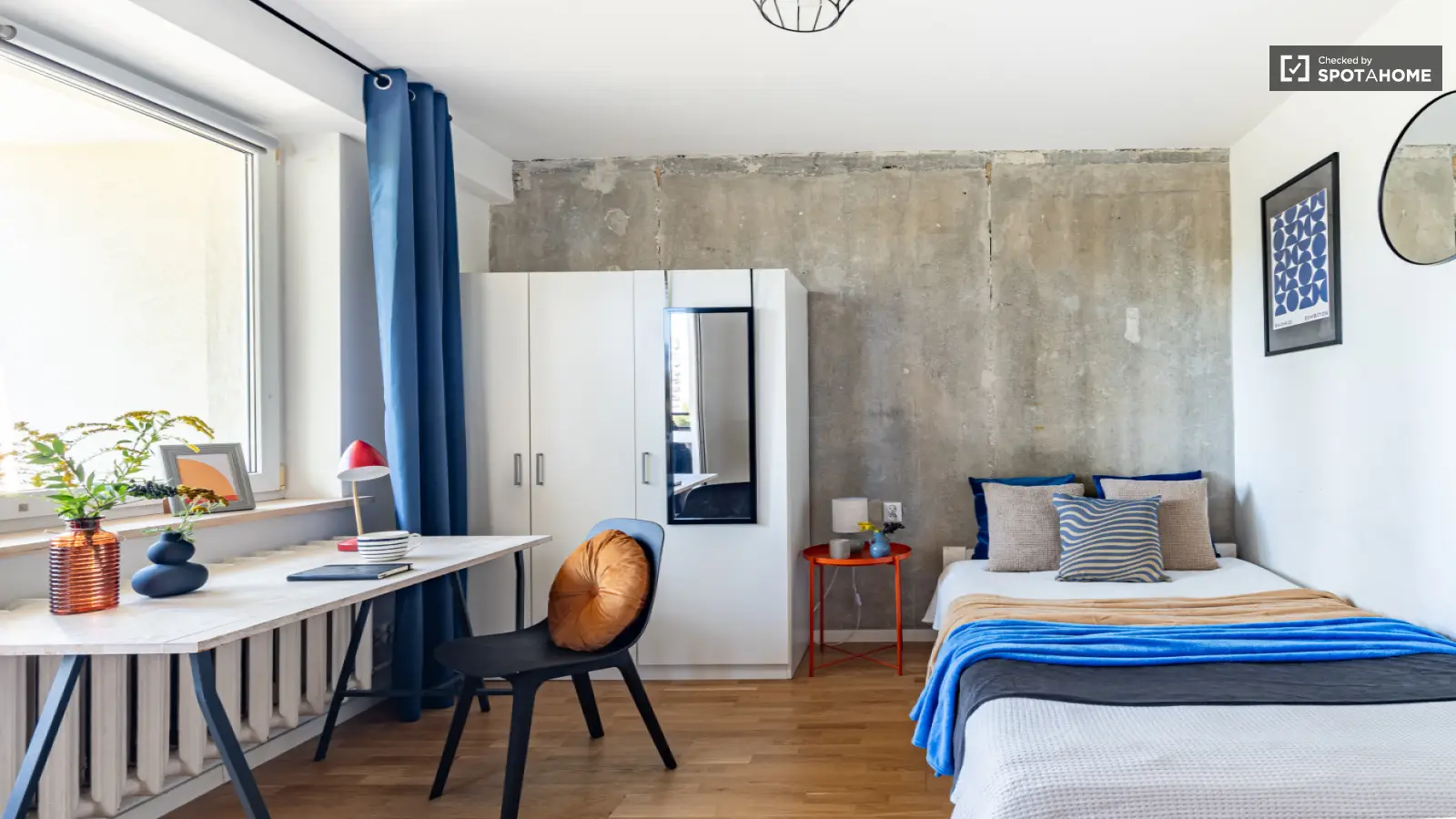 Bedroom 2 has a single bed, a desk with a chair, and a large standalone wardrobe. Its unique shelving is also great for storage. You'll love the exposed cement on the wall and the modern artwork and light fixtures. The balcony looks out onto the tranquil courtyard.